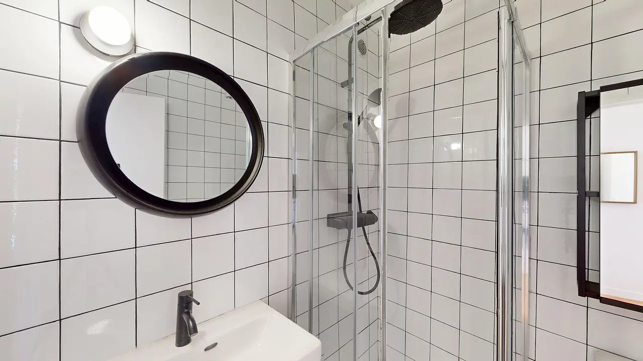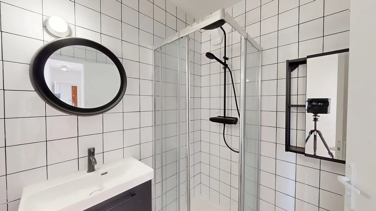 La première salle d'eau comporte une douche, un meuble vasque avec miroir, ainsi que des rangements. Les WC sont séparés.