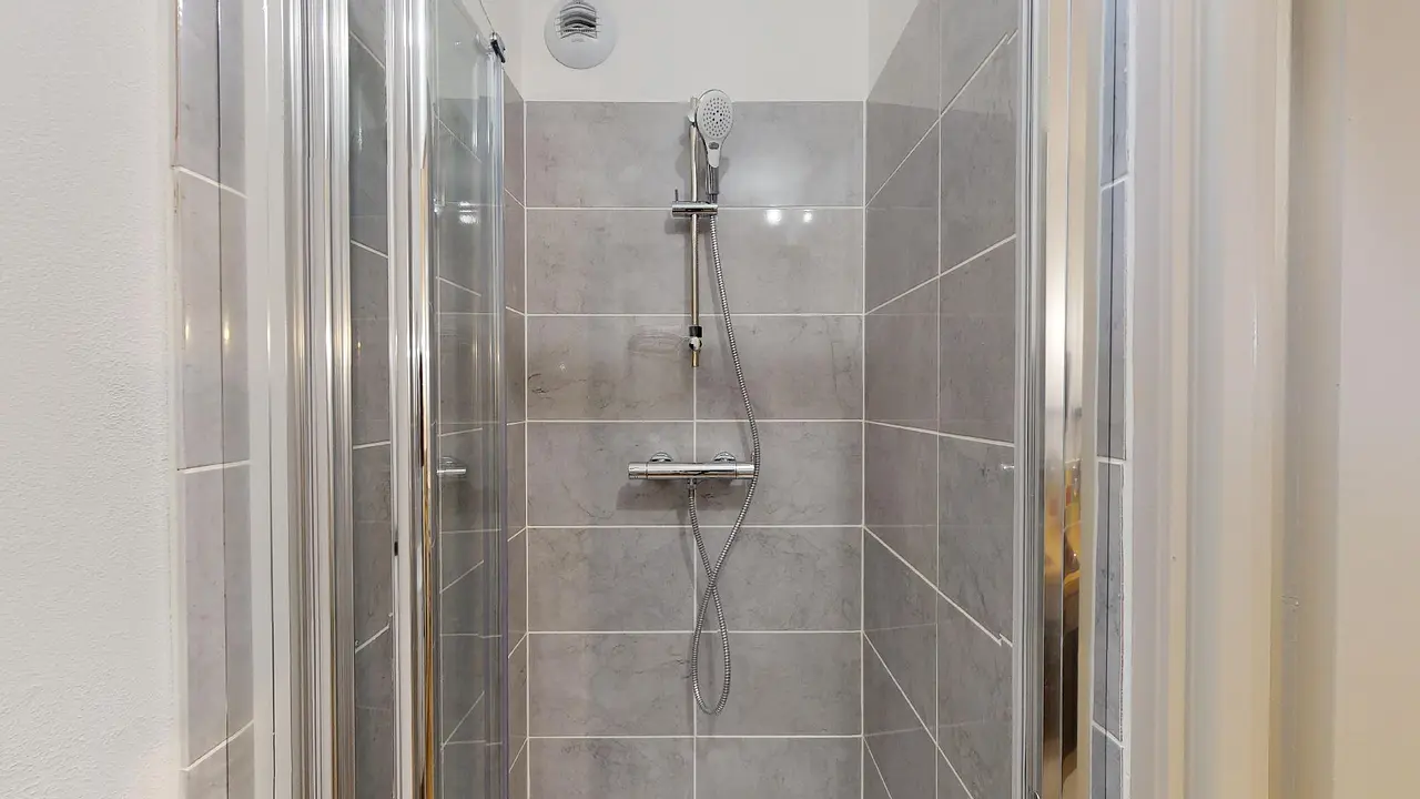 Ce T6 propose un salon avec un canapé, un fauteuil, une table à manger ainsi qu'une télévision, quatre chambres, une cuisine et une salle de bains équipée d'une baignoire ainsi que d'une douche.
