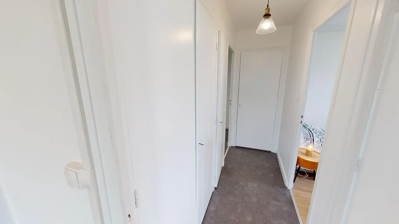 Mobilier : lit double entouré de deux petites tables de nuit avec lampes de chevet, d'un bureau, d'un espace penderie et de quelques étagères pour ranger ses vêtements Il est à noter que le couloir dispose de grands espace de rangements qu'il est possible de se répartir entre colocs.