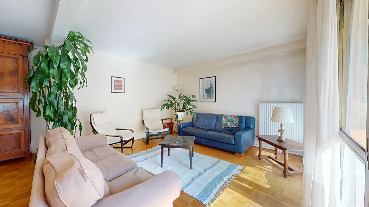 L'appartement s'ouvre sur une entrée avec rangements desservant un spacieux séjour. Celui-ci dispose de deux canapés, de deux fauteuils, d'une table basse, d'une table avec 6 chaises et de rangements.