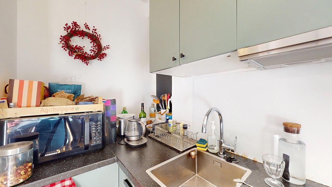 La cuisine ouverte est équipée d'un micro-ondes, d'un réfrigérateur, d'un lave-linge, d'un évier ainsi que de nombreux rangements.