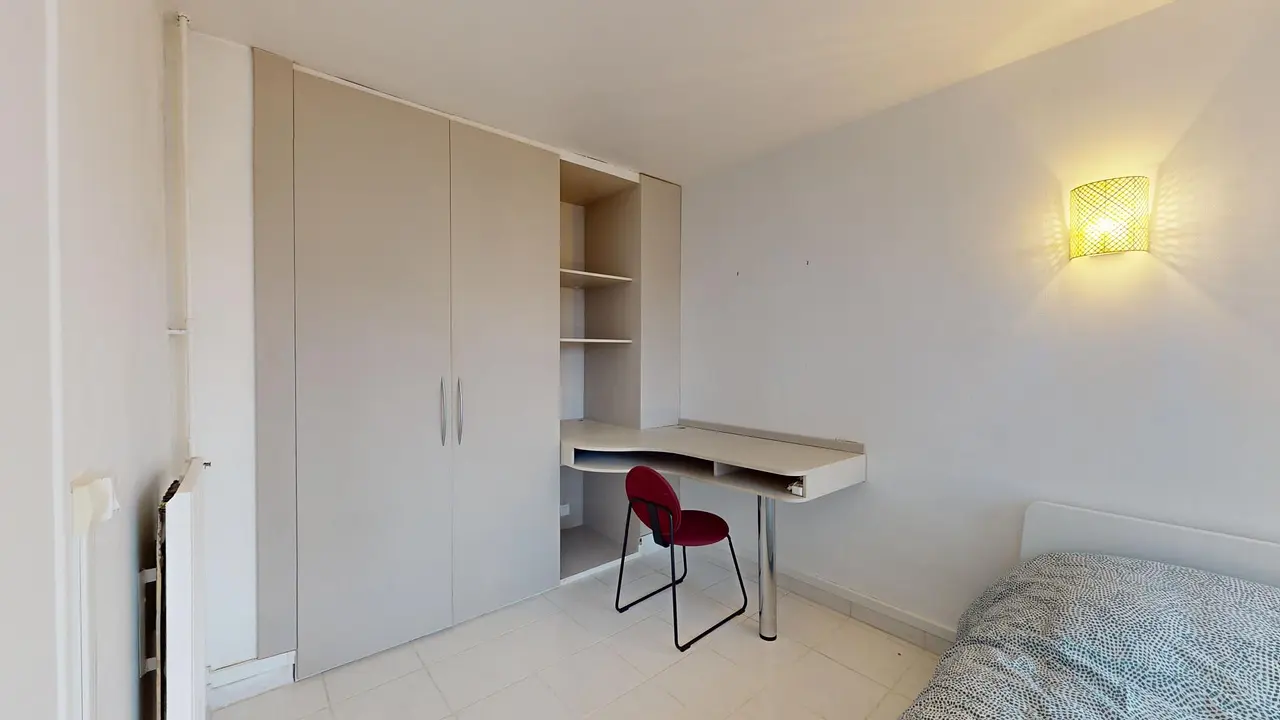 Cette chambre possède un lit double, bureau et placard de rangement.
