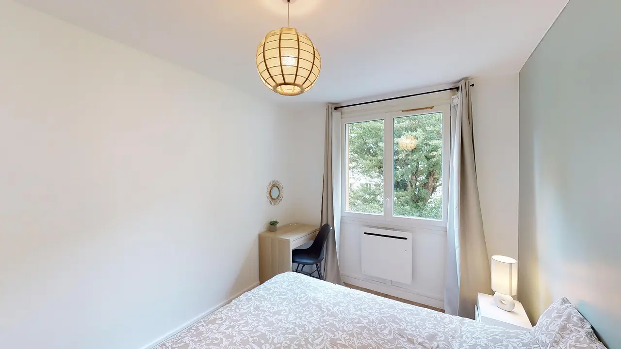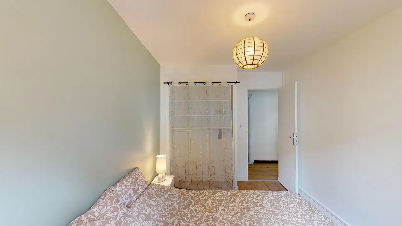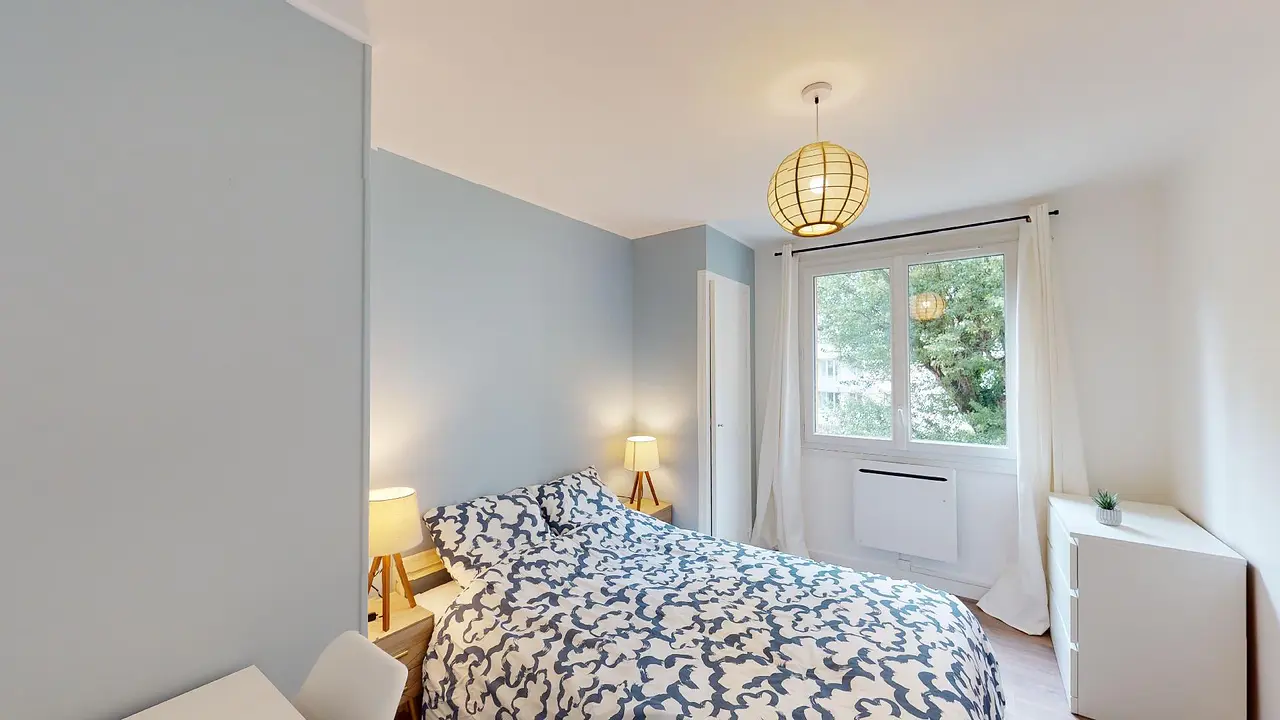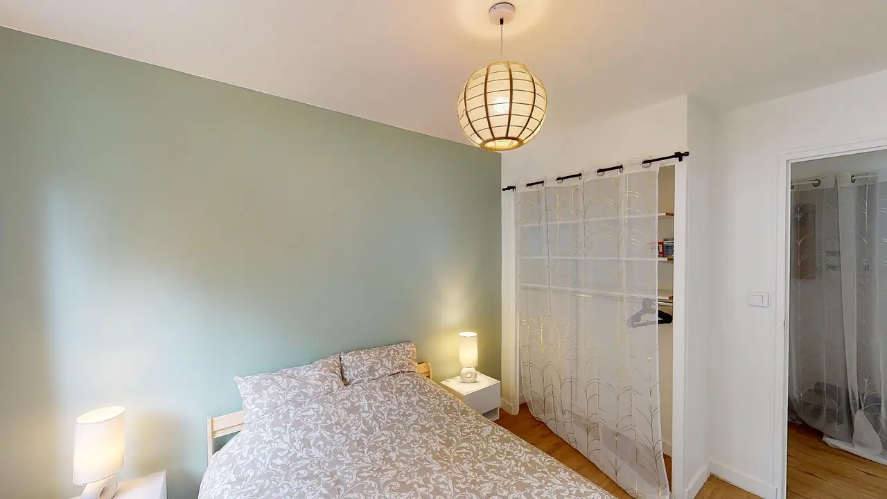 Enfin, les deux chambres disposent d’un lit double, d’un bureau, de deux tables de chevet accompagnées de lampes et de rangements.