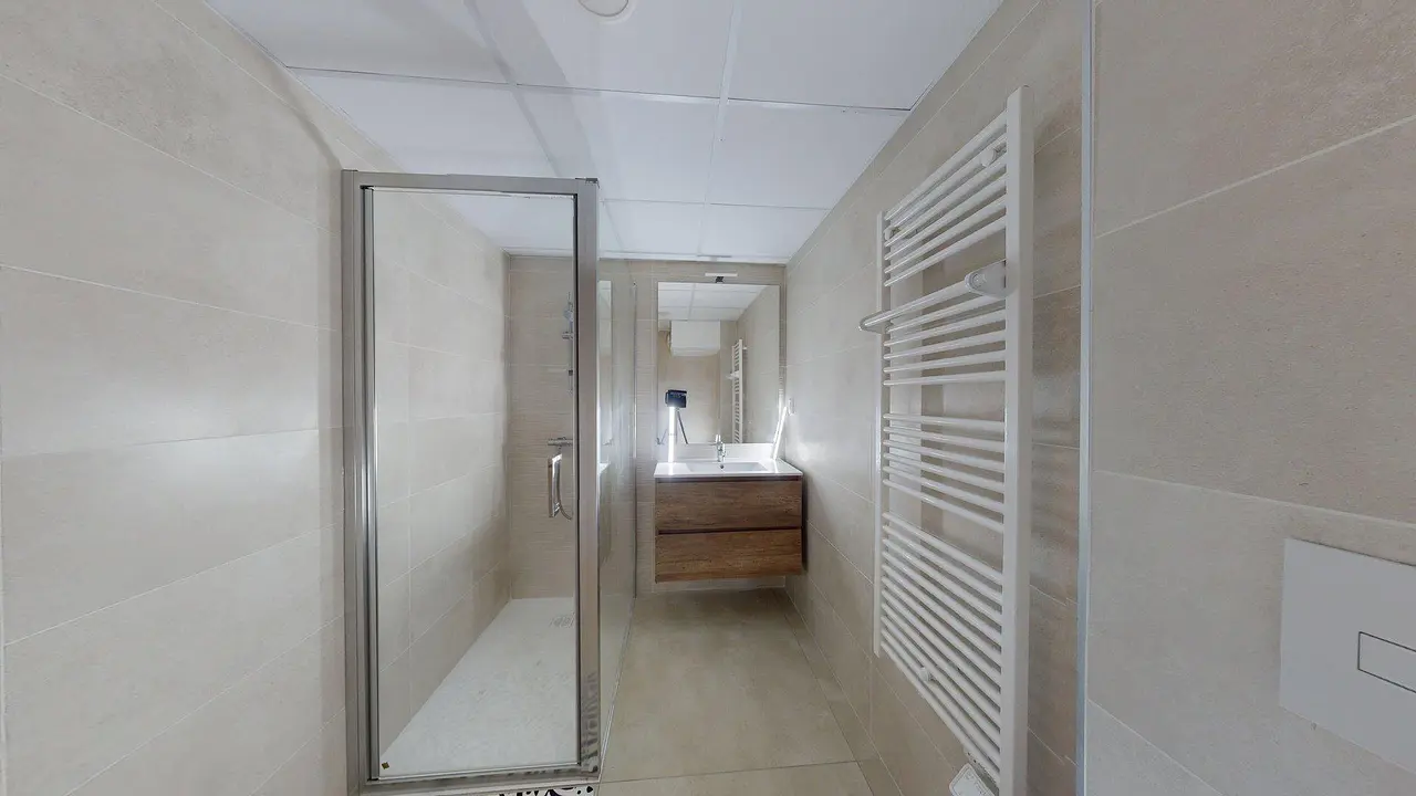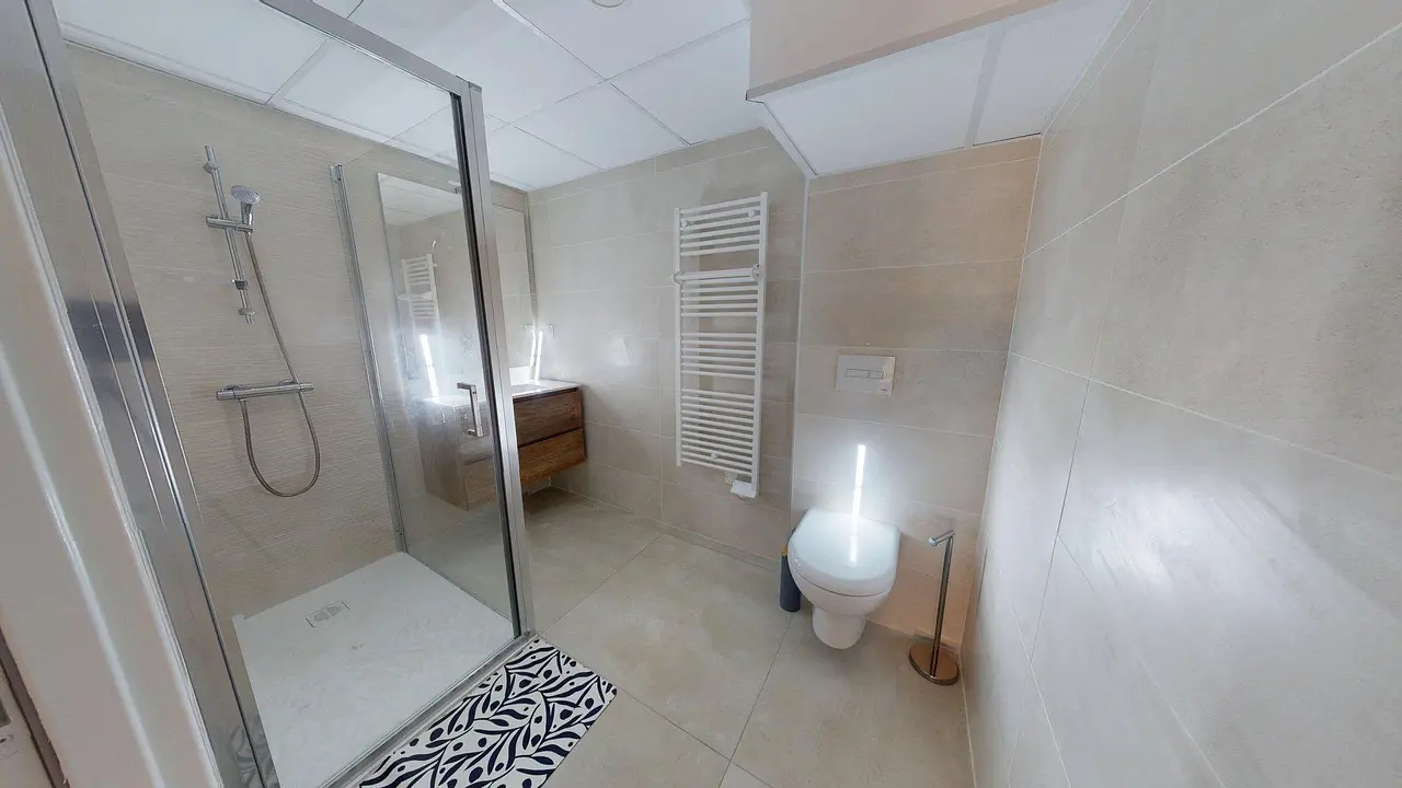 Les deux salles d'eau de chaque étage disposent d'une cabine de douche, d'un meuble vasque avec un miroir ainsi que d'un sèche-serviettes. 3 toilettes sont présentes à chaque étage, dont deux séparées.