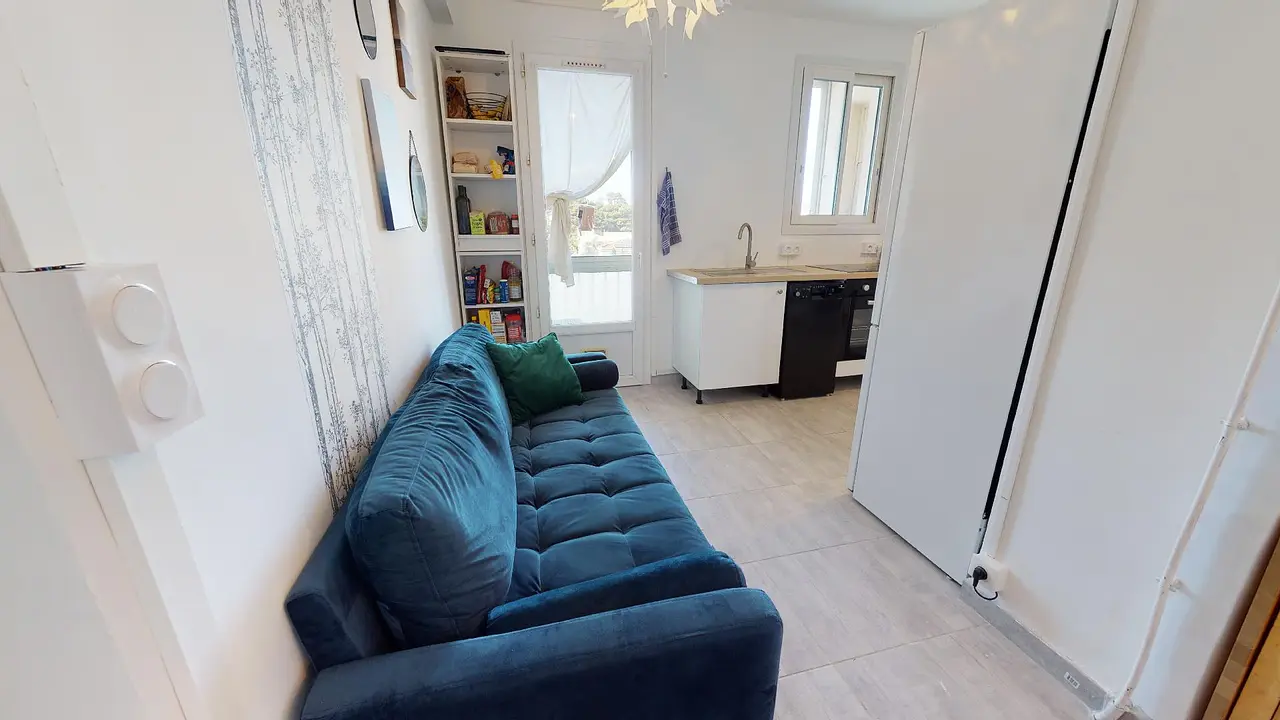 La porte d’entrée de cette colocation s’ouvre sur une pièce de vie avec un salon moderne aménagé avec un canapé, des rangements et une cuisine ouverte.