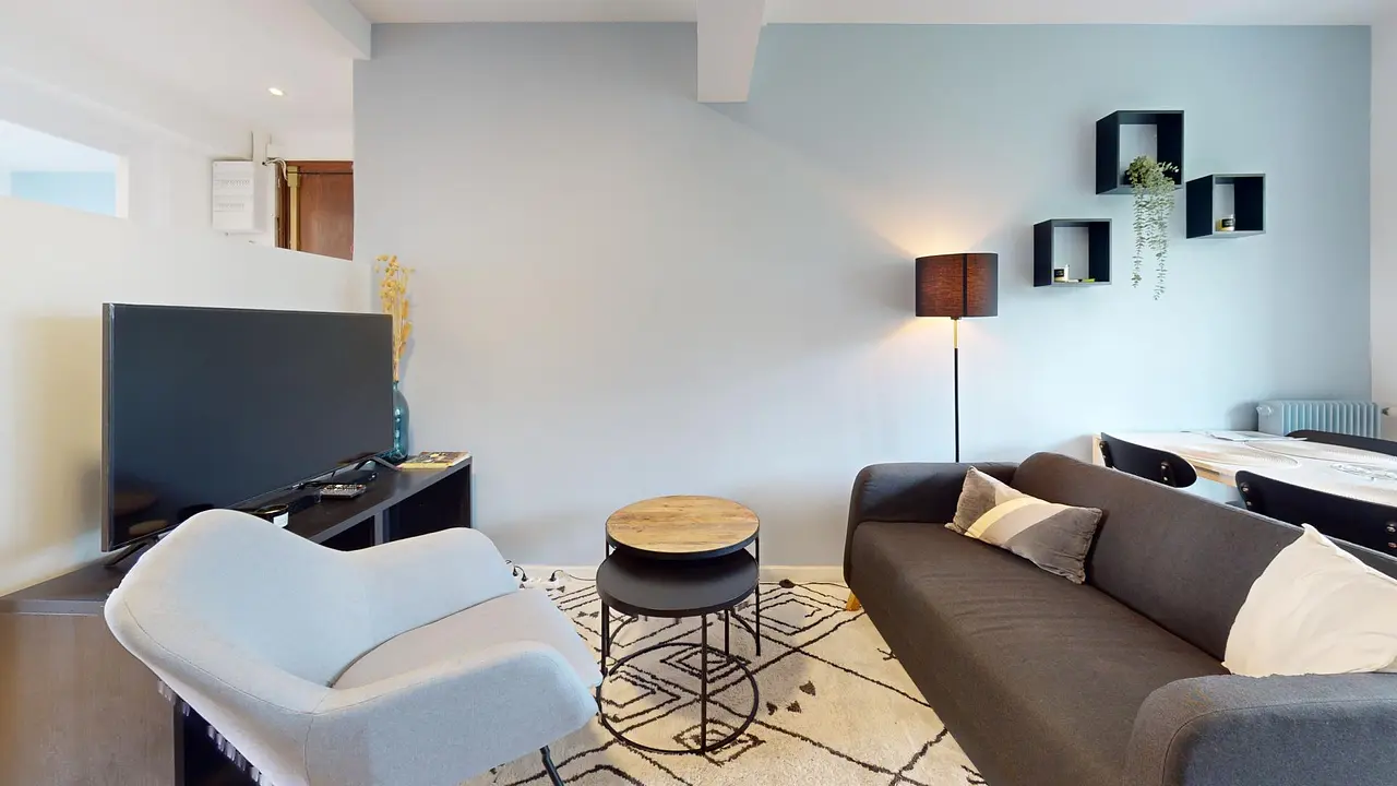 Un salon entièrement meublé avec un canapé, un fauteuil, une table basse, un meuble Tv avec sa télévision, une table à manger avec ses chaises.