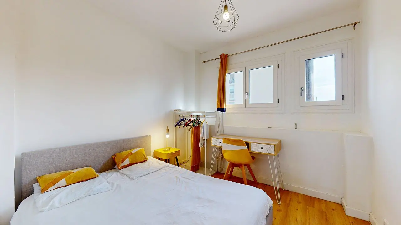 La chambre 3 est aménagée avec un lit double, une table et une lampe de chevet, un bureau avec chaise, une penderie ainsi qu’un miroir. Elle bénéficie d’un accès au balcon commun avec le séjour et la cuisine, apportant luminosité et confort.