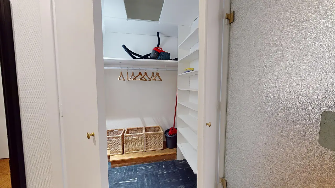 Cette colocation a été rénovée durant l'hiver 2024. La porte d'entrée du logement s'ouvre sur un couloir avec un grand placard de rangement partagé qui dessert la pièce de vie.
