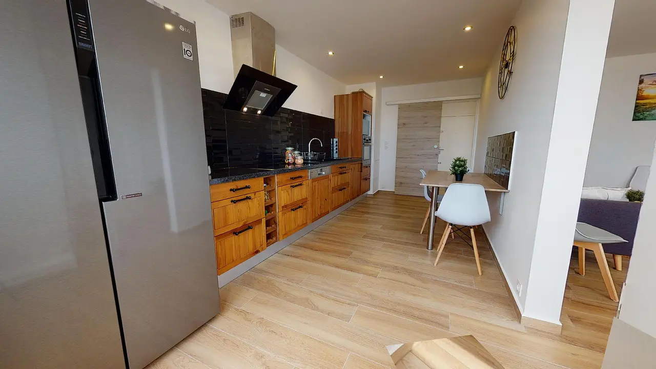 Entièrement rénové, meublé et agencé avec goût, cet appartement offre un cadre de vie optimal (cuisine indépendante entièrement équipée, grand salon, parquet au sol, grands placards muraux dans le couloir, balcon/loggia, toilettes séparées, etc...). Le petit hall d’entrée permet d’accéder à la salle de bain, aux toilettes, à la cuisine et au salon. Un couloir conduit à deux des chambres, tandis que la troisième est accessible depuis le salon.