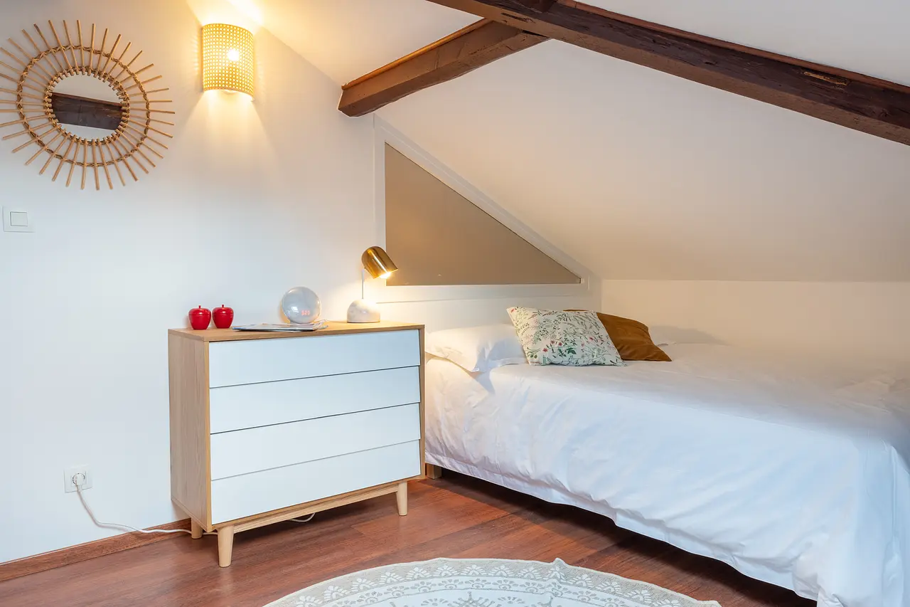 La chambre 7 se trouve au 2e étage et mesure 9m2. Elle possède le charme des pièces mansardées avec poutre apparente et dispose, en termes de mobilier, d'un lit double, de deux commodes et d'un bureau, ainsi que de patères au mur. Une serrure sécurise avec code en garde l'accès.