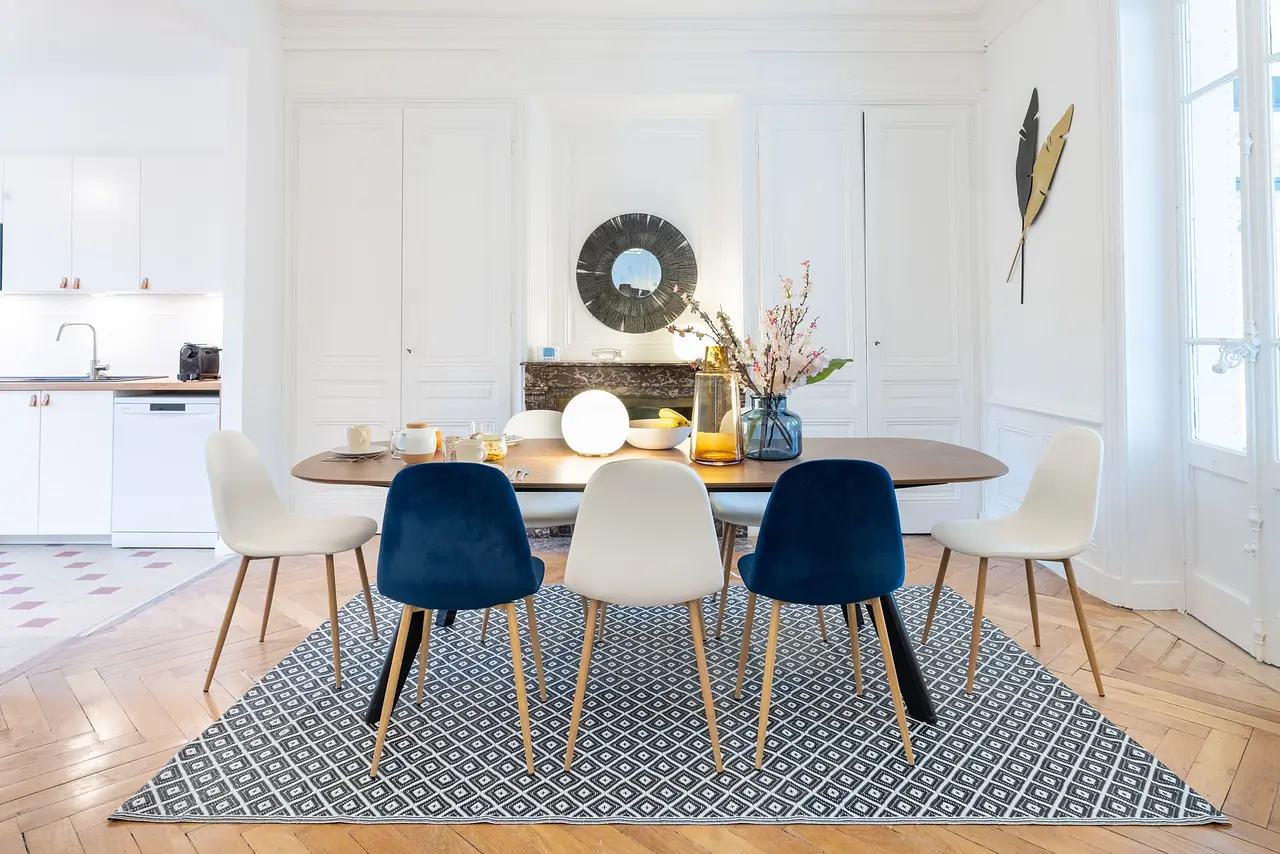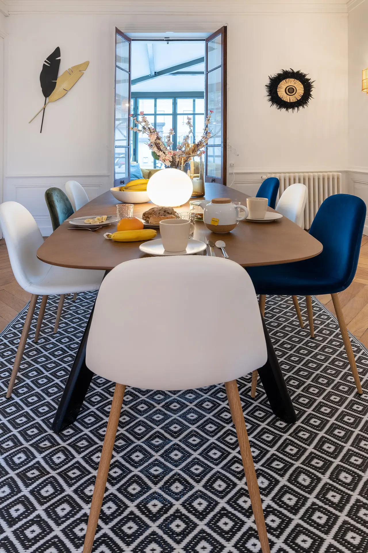 La cuisine est équipée de 2 fois 3 plaques de cuisson, 2 fours, 2 lave-vaisselle, 2 grands frigos avec espace congélateur, 2 micro-ondes. La salle à manger est superbe : parquet à la française, cheminée, belle hauteur sous plafond et moulures : de quoi magnifier une simple assiette de pâtes carbonara.
