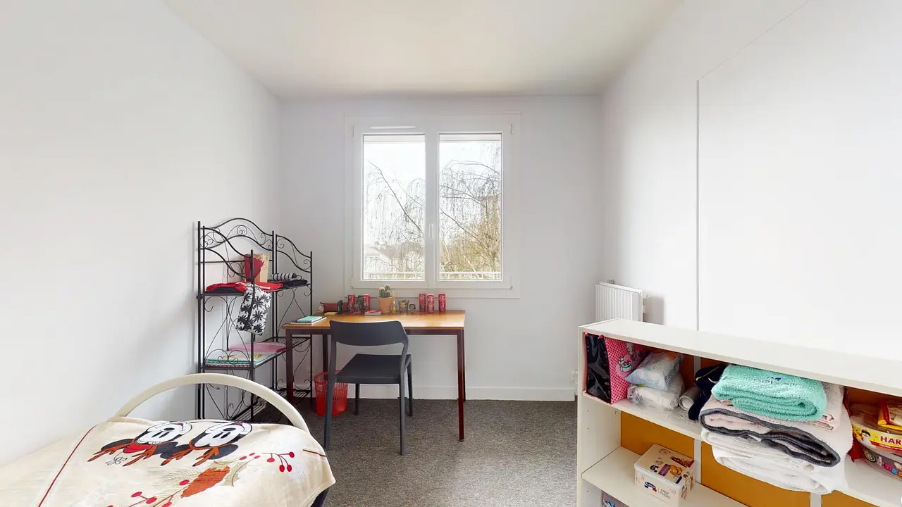 Cette chambre est la plus grande de la colocation. Elle donne accès à un balcon. Elle s'équipe d'un lit simple, bureau et rangements.
