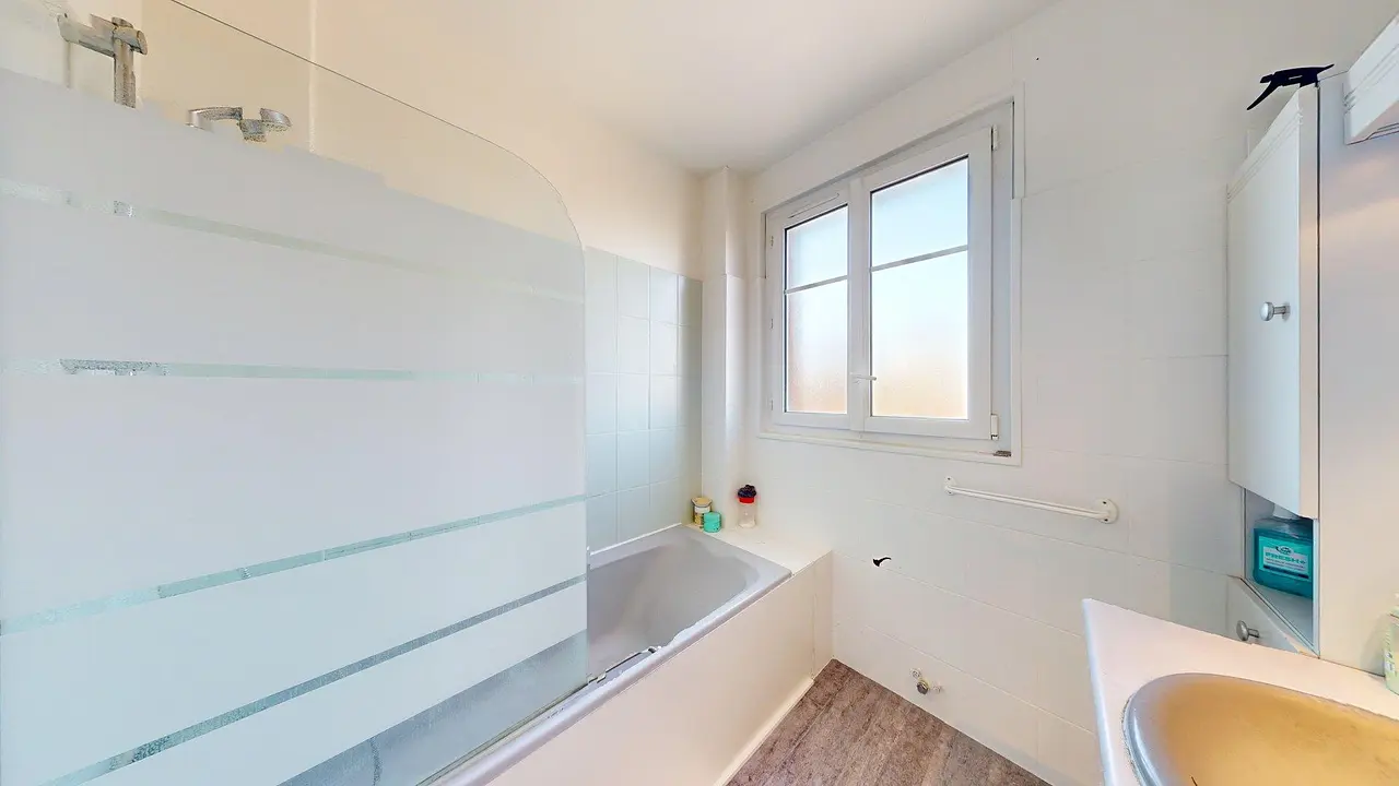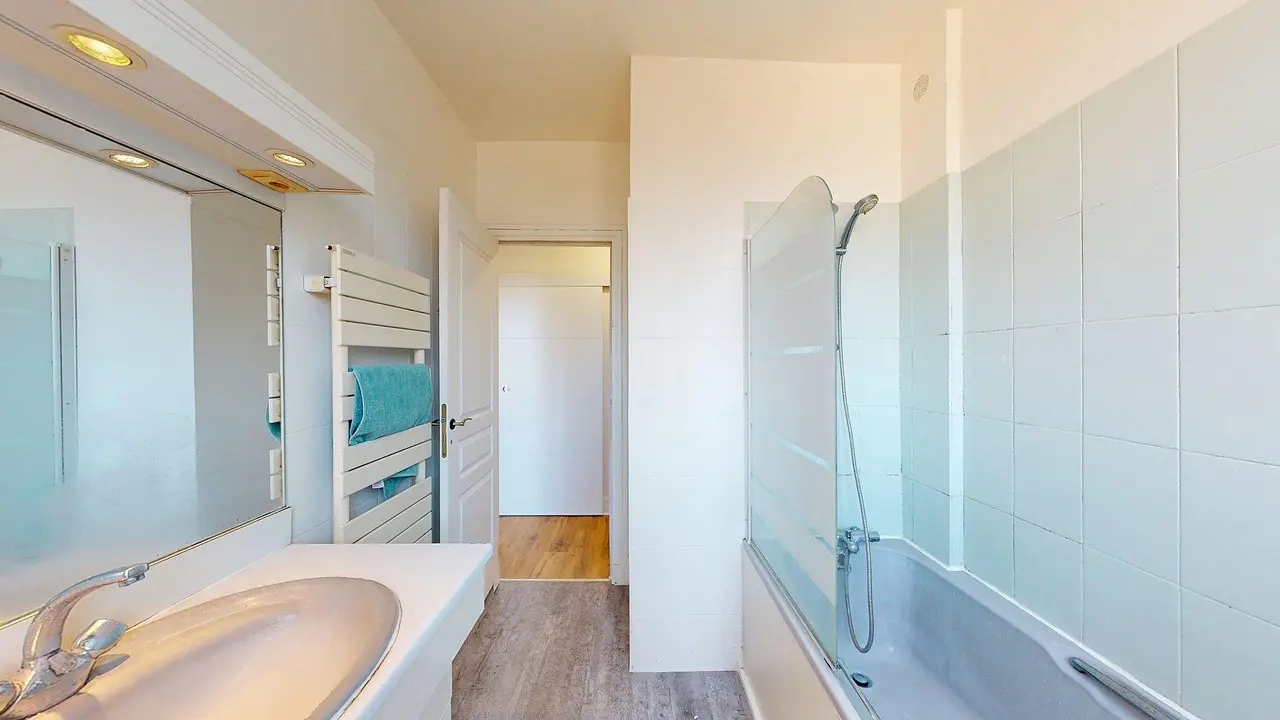 Enfin, l'appartement comprend une salle de bain fonctionnelle dotée d'une baignoire, d'un meuble vasque avec miroir et d'un sèche-serviettes.