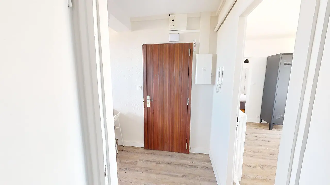 La colocation se compose d'un hall d'entrée, accédant à une pièce de vie agréable équipée d'un canapé, table basse, télévision, rangements, très utile pour les étudiants.