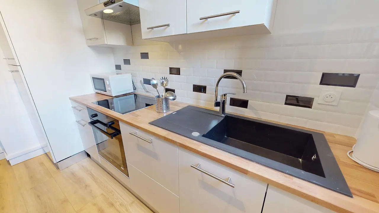 Les parties communes de ce logement se compose d'un salon aménagé avec un canapé d'angle, une table basse, un placard de rangement et un pouf. La cuisine quant à elle est séparée.