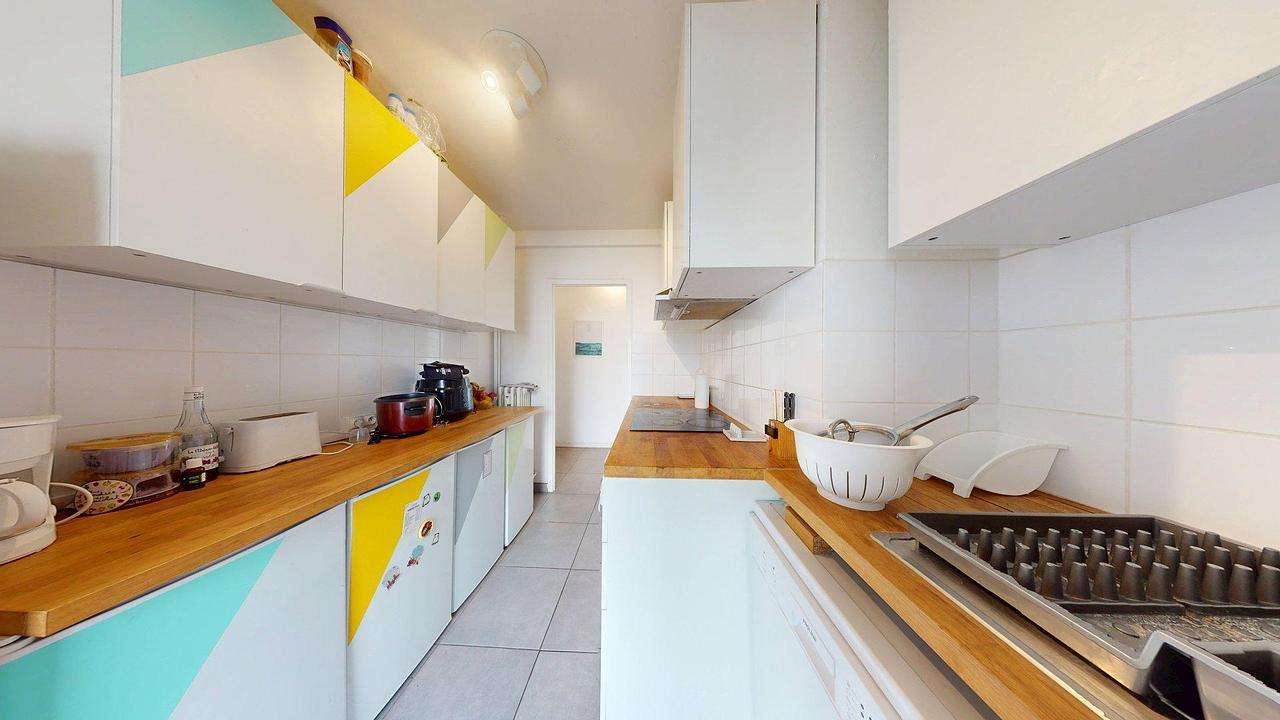 La cuisine est entièrement équipée avec des plaques de cuisson, un four, un micro-ondes et un lave-vaisselle. Chaque colocataire bénéficie de son propre réfrigérateur individuel ainsi que d'un placard de rangement dédié. Le logement profite également d'une loggia faisant office de buanderie avec lave-linge, ainsi que d'une salle d'eau fonctionnelle avec douche a l'italienne.