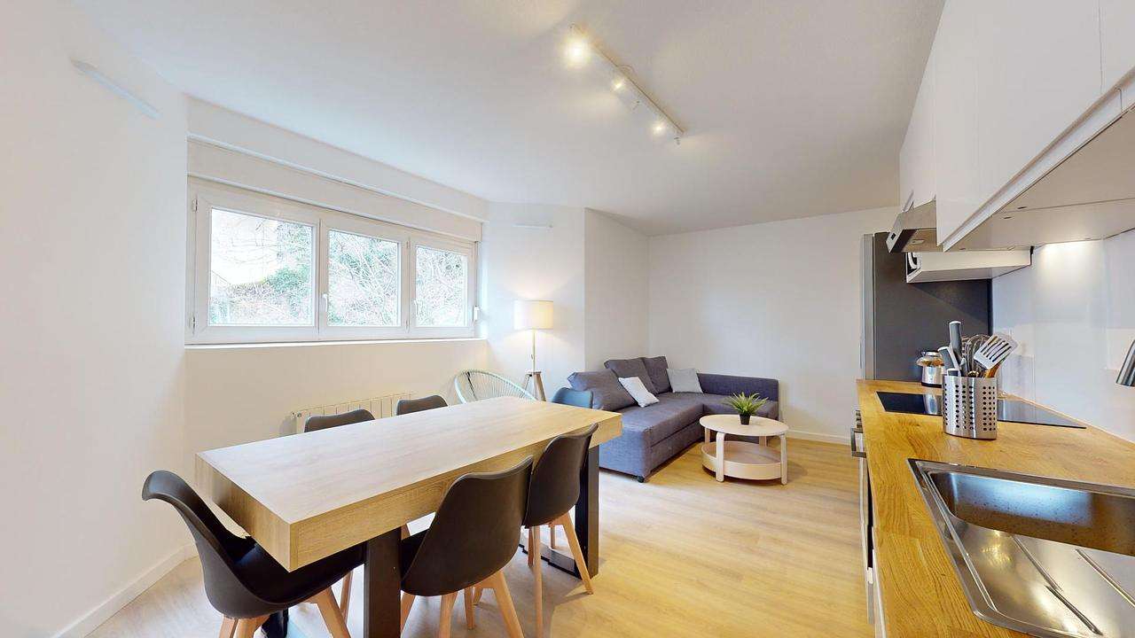 Cette colocation de quatre chambres s'ouvre sur une spacieuse pièce de vie comprenant un coin cuisine et un coin séjour.