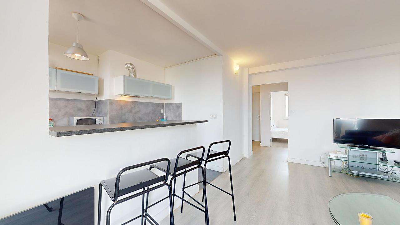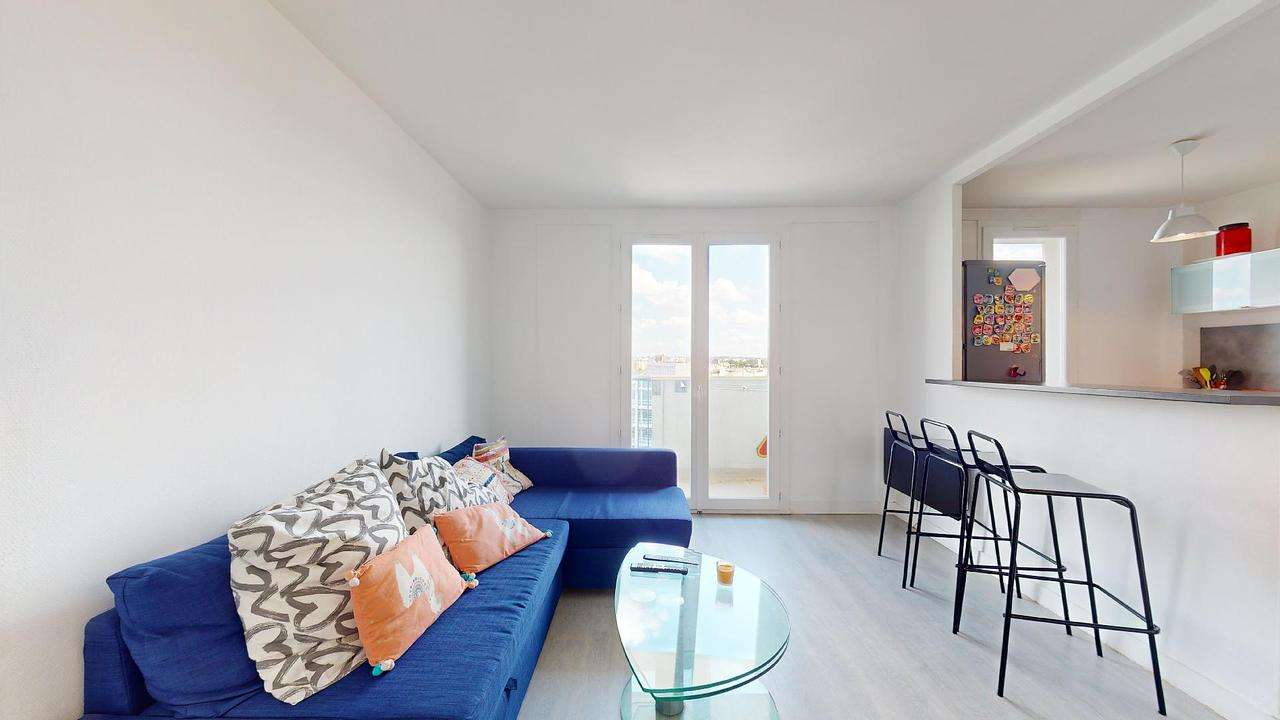 Cette colocation de trois chambres s'ouvre sur une pièce de vie avec un coin salon et un coin cuisine séparé par un bar avec trois tabourets.