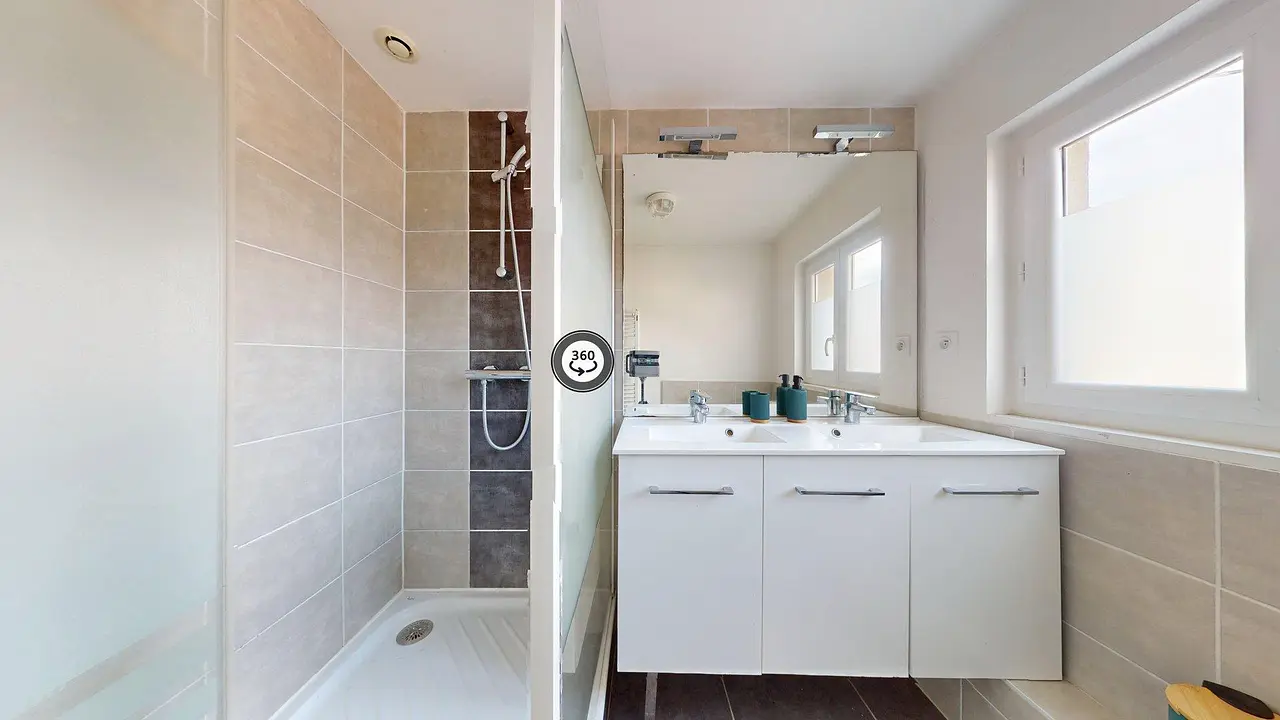 Enfin, la salle d'eau moderne et fonctionnelle comprend deux douches indépendantes ainsi qu'un meuble double vasque avec un grand miroir. Les WC sont également situés dans cet espace.