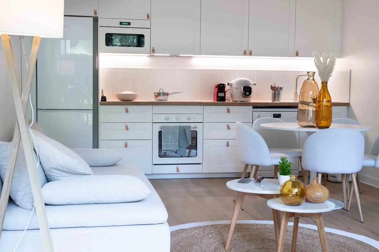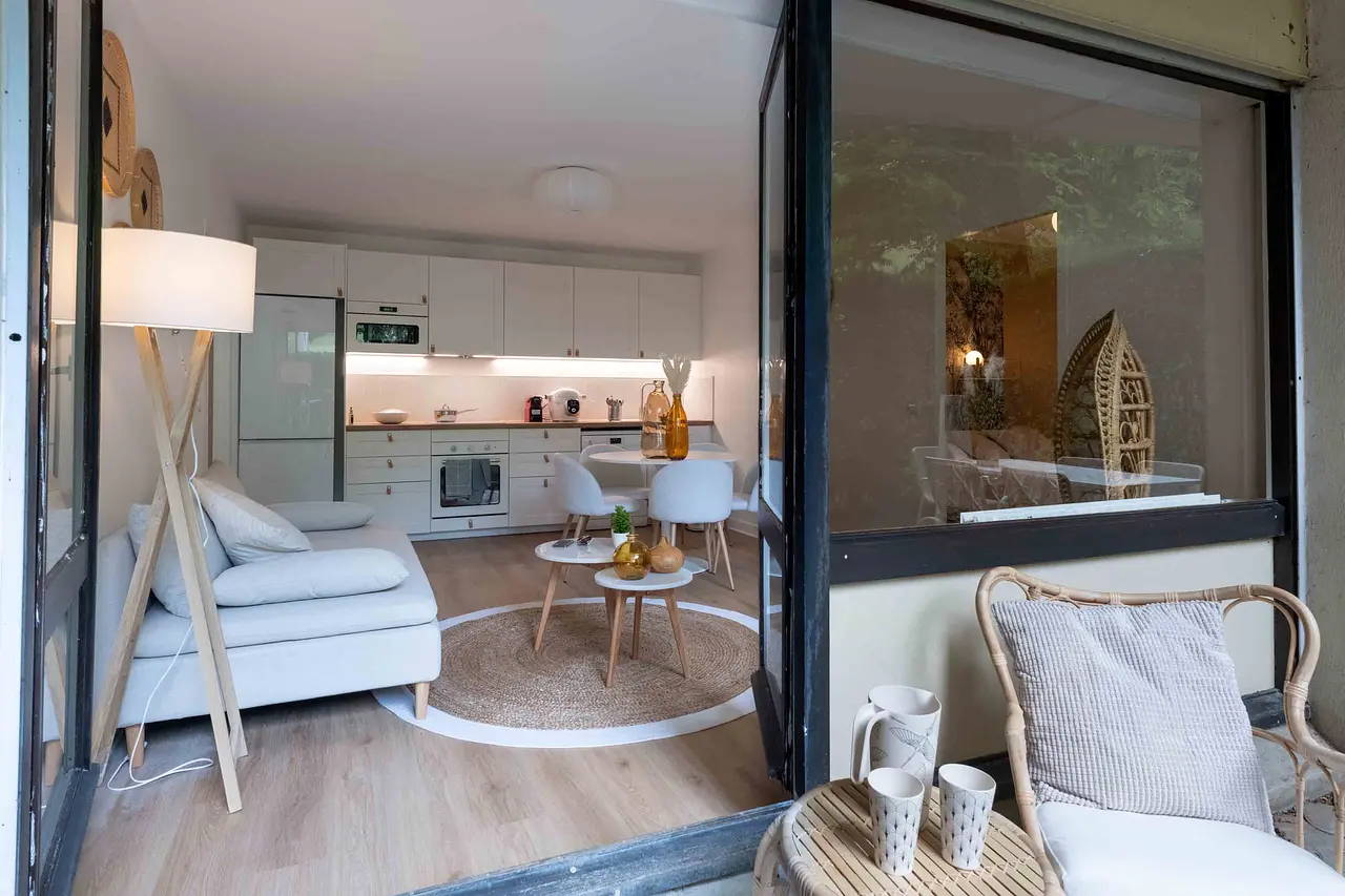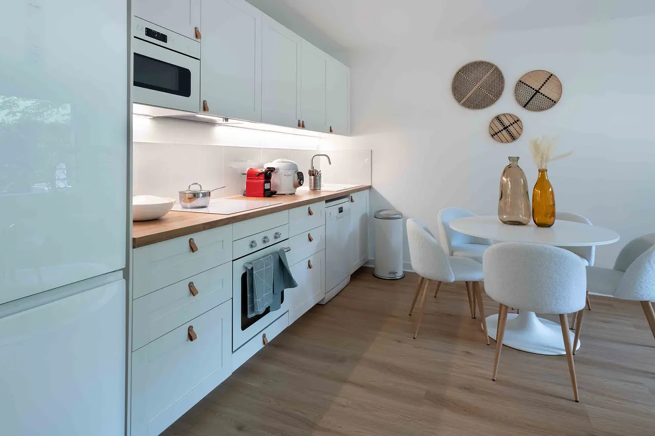 La surface totale de l'appartement est de 110m² et il bénéficie de grandes parties communes de plus de 25m², comprenant une cuisine ouverte équipée avec des électroménagers récents tels qu'un lave-vaisselle, un micro-ondes, un four encastrable, des plaques de cuisson à 4 feux, une hotte, un réfrigérateur-congélateur à deux portes, une bouilloire, une machine à café Nespresso, un multicuiseur Cookeo Moulinex et une Sodastream, ainsi qu'une machine à laver, une literie double, une télévision et un bureau dans chaque chambre.