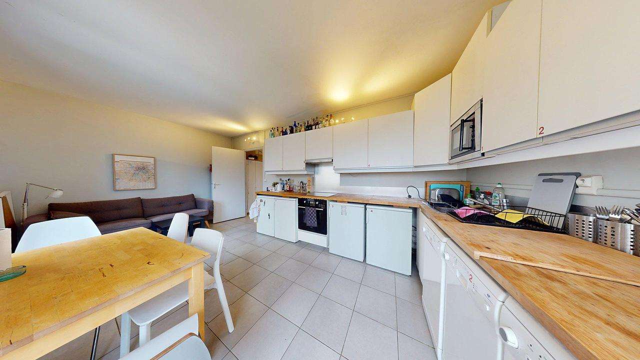 La pièce de vie principale, lumineuse et conviviale, se compose d’une cuisine ouverte sur un salon équipé d'un canapé. Cet espace de partage donne un accès direct à un premier balcon privatif, idéal pour profiter de l'extérieur. L'appartement dispose également d'un second balcon, partagé par trois des quatre chambres, offrant un espace extérieur supplémentaire. La cuisine a été spécialement conçue pour garantir une autonomie totale à chacun : en plus du four, du micro-ondes et des plaques de cuisson, chaque locataire dispose de son propre lave-vaisselle, de son propre réfrigérateur ainsi que de deux placards attribués. Cette organisation unique au sein d'une colocation facilite grandement le rangement et la gestion du quotidien pour les quatre occupants.