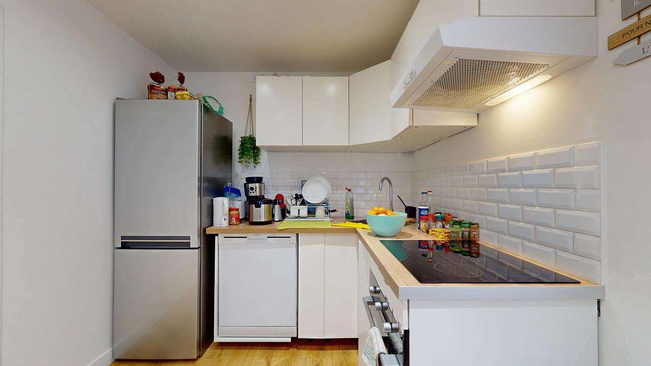 La cuisine est équipée d'un réfrigérateur avec congélateur, d'une bouilloire, d'une machine à café, d'un four, de plaques de cuisson avec une hotte, d'un lave-vaisselle, d'un évier avec égouttoir ainsi que de nombreux rangements.