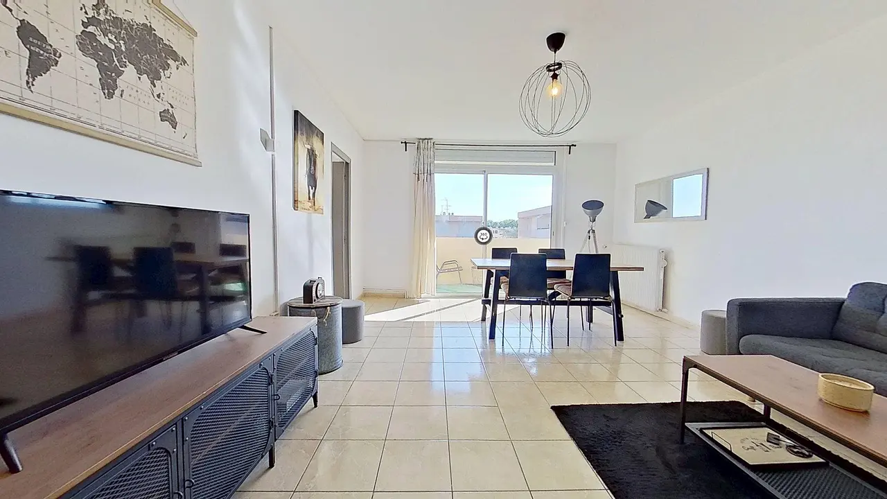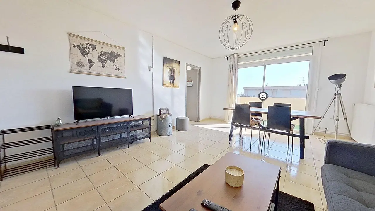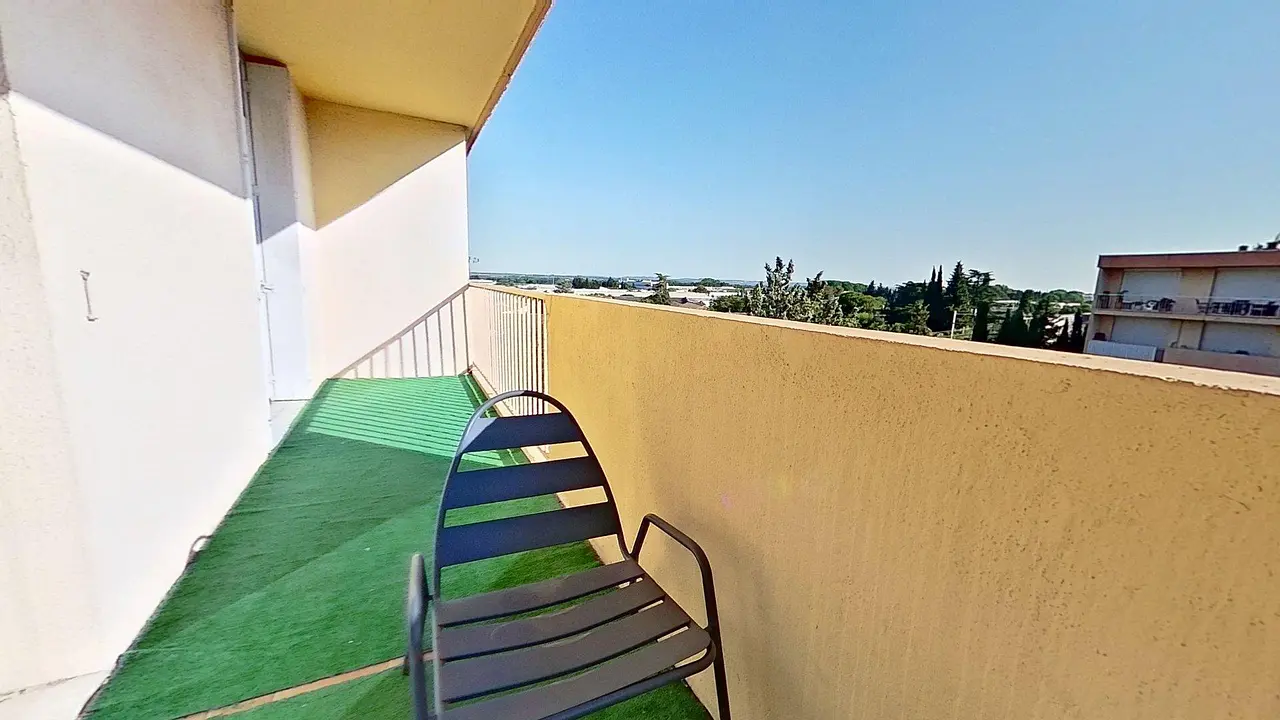 La pièce de vie est meublée avec un canapé, une table basse, un meuble TV avec TV, une table pouvant accueillir 4 personnes. On y trouve un grand balcon traversant deux des chambres, il est meublé d'une table, de deux chaises et donne sur une vue dégagée.