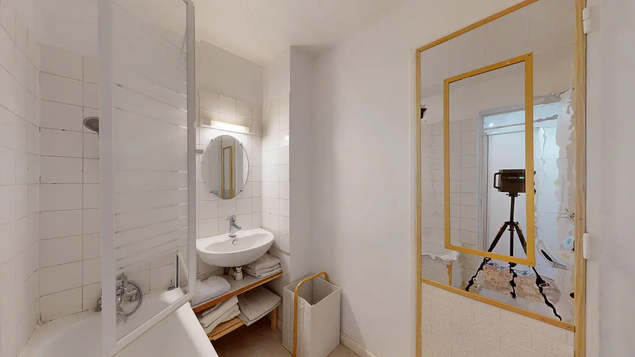 La salle de bain comporte une baignoire et un meuble vasque avec miroir. Les WC sont séparés.