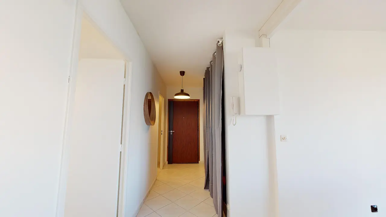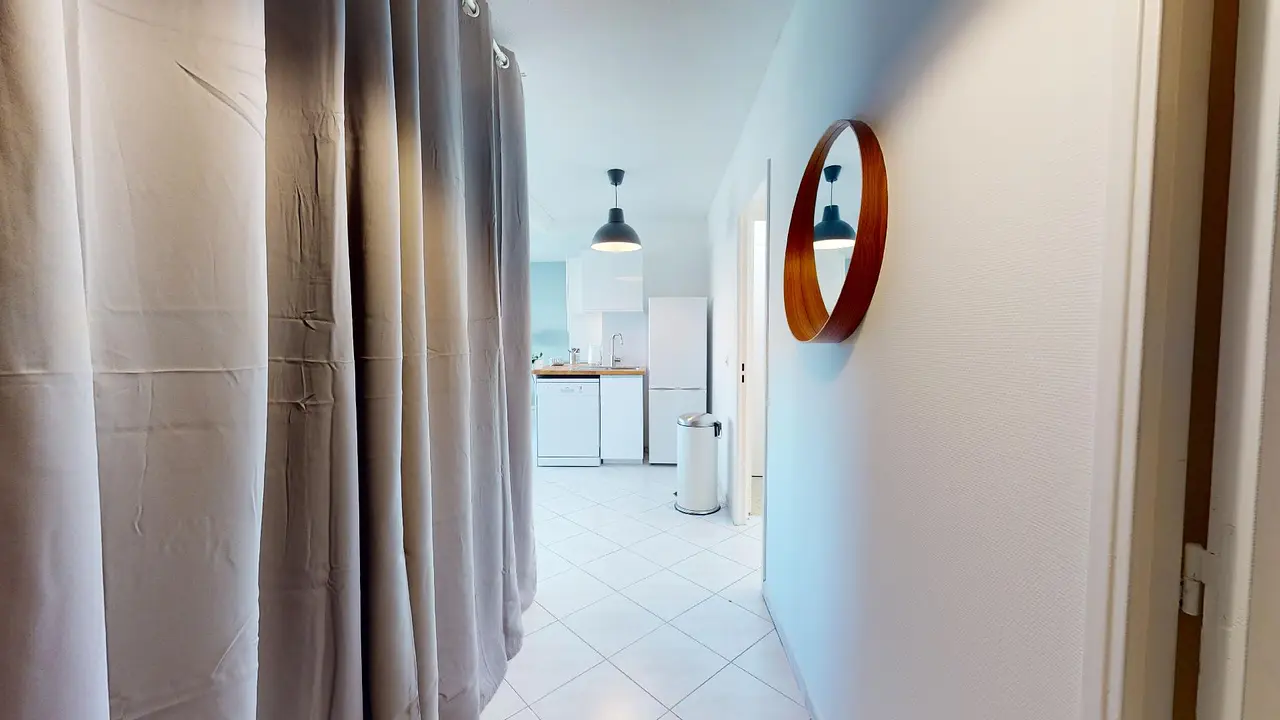 La colocation comporte une pièce de vie lumineuse avec un espace salle à manger et table pour tous les colocataires, et un coin salon avec canapé, et table basse. Le séjour donne accès à un balcon !