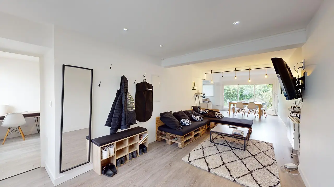Son intérieur se divise en un salon équipé d'un canapé, d'une table basse, d'une table à manger, d'un miroir ainsi que d'une télévision et de nombreux rangements. Le salon ouvre, grâce à une porte fenêtre, sur une terrasse équipée de chaises et d'une table de jardin.