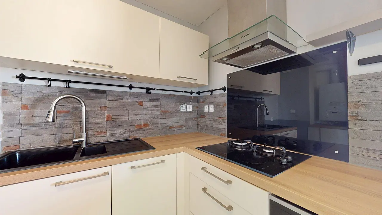 La cuisine est équipée d'un four, de plaques de cuisson, d'une hotte, d'un lave-vaisselle, d'un ilot central, ainsi que de nombreux rangements.