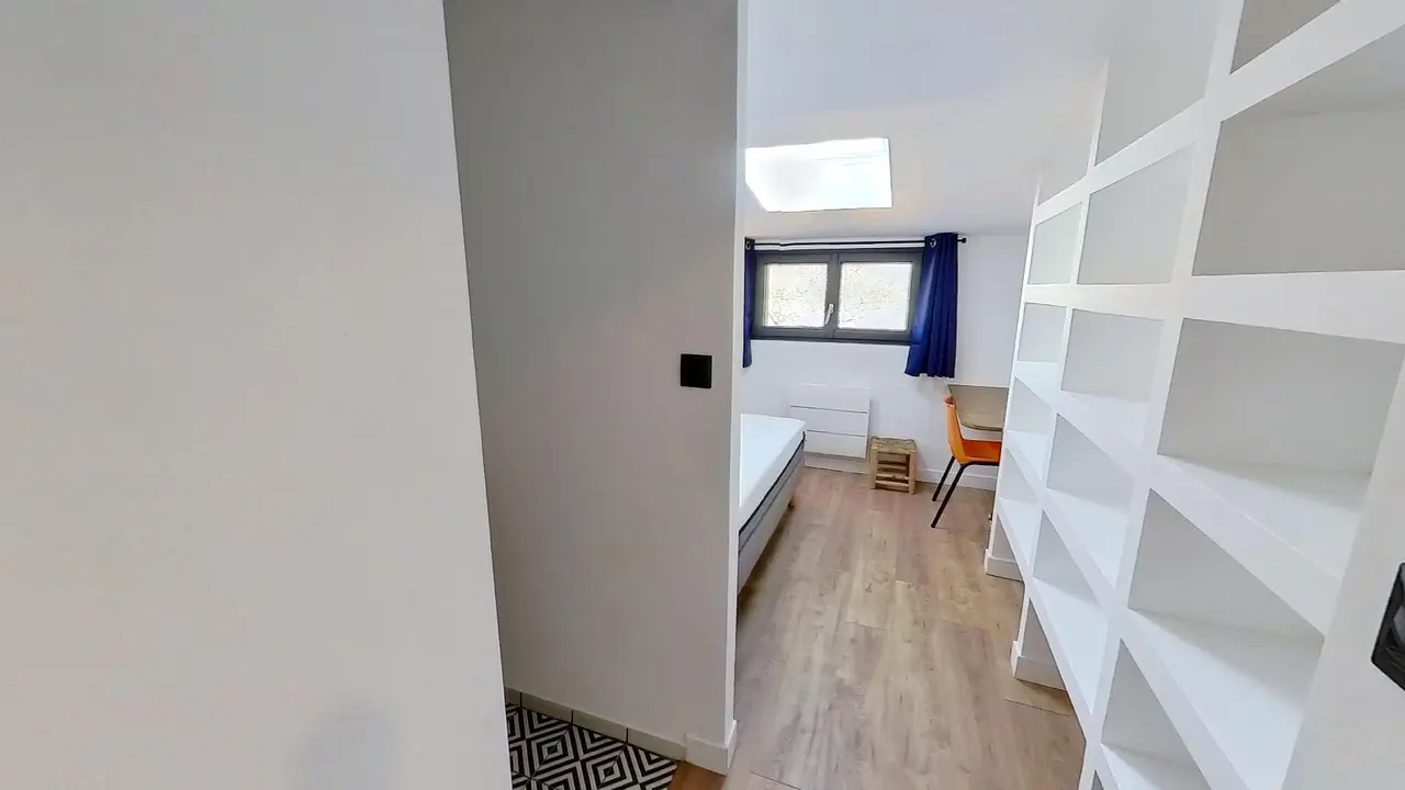 Cette maison sur 2 étages comporte au rez-de-chaussée les parties communes de la colocation ainsi que 2 des 7 chambres. Le 1er étage comporte les 5 autres chambres de la colocation.
