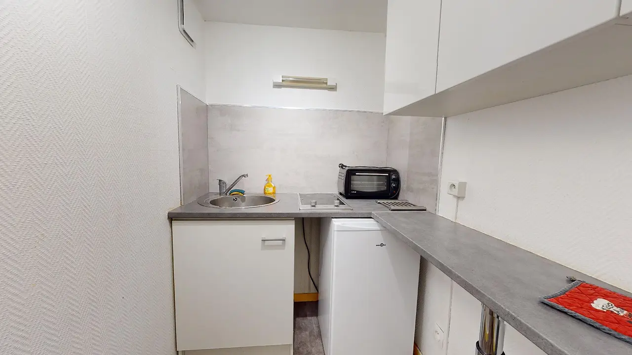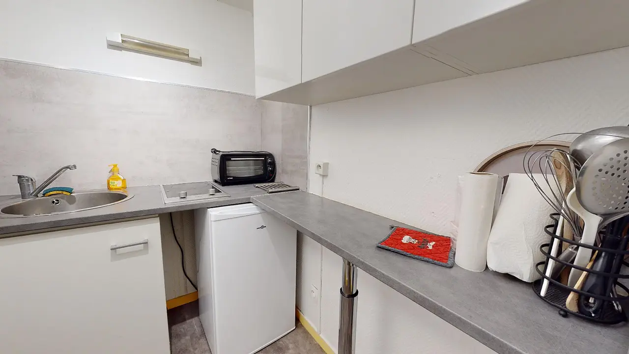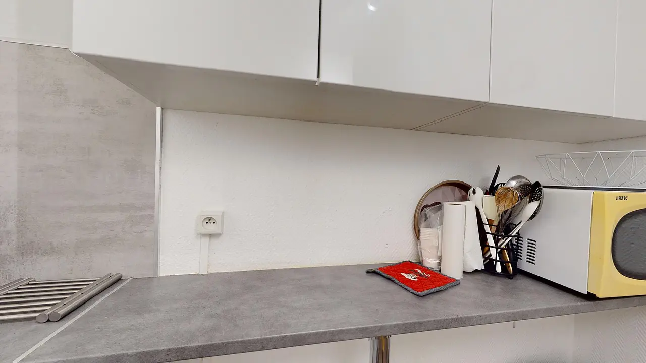 Au centre de ces deux pièces indépendantes, se trouve une cuisine et une salle de bain commune. La cuisine s’équipe d’un frigidaire, d’un four d’appoint, d’un micro-ondes, ainsi que plusieurs placards de rangement. La salle de bain est quant à elle munie d’un meuble vasque ainsi que d’une douche. Il est d’usage que les colocataires conviennent d’une organisation qui sied à tous.