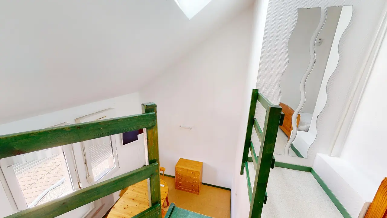 L’appartement est divisé en deux parties identiques, chacune munie d’une table, de plusieurs chaises, d’un lit simple en mezzanine, ainsi que d’une TV murale.