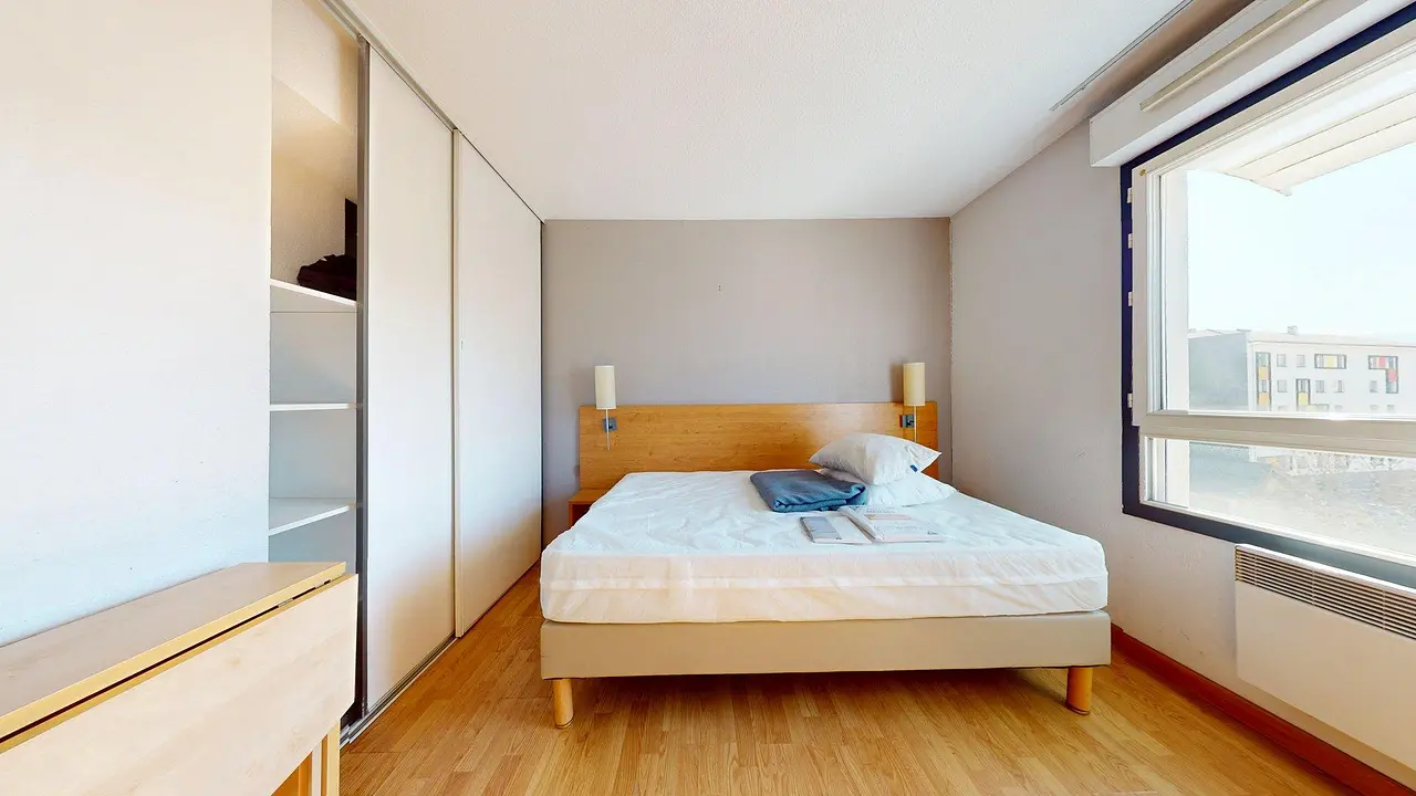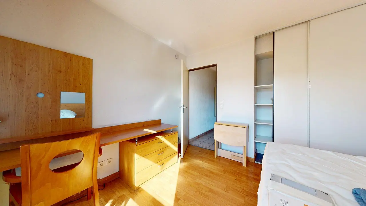 🏠 LE LOGEMENTLa pièce de vie principale, lumineuse et optimisée, est dotée d'un lit double, d’une armoire de rangement, d’un bureau avec tiroirs et d’une table pliable pour gagner de l’espace.