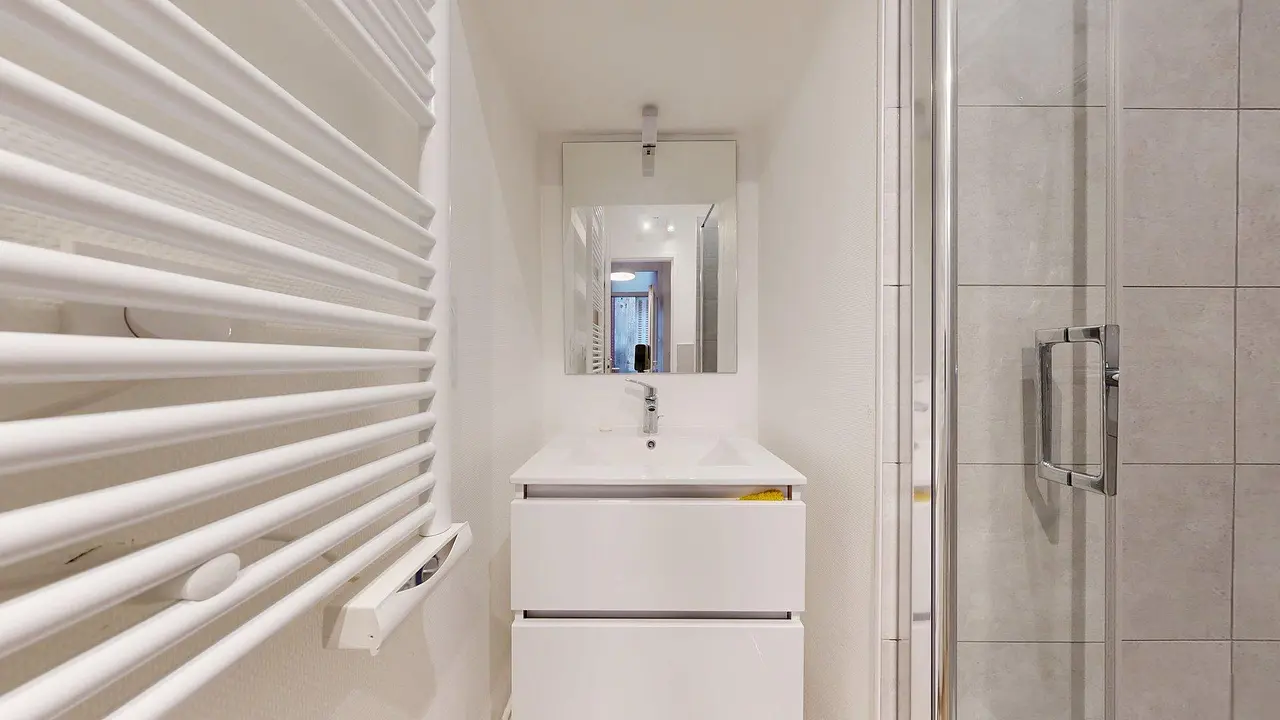La salle d'eau comporte une douche moderne avec paroi vitrée, un meuble vasque avec de larges tiroirs de rangement, un miroir, un sèche-serviettes et des WC.
