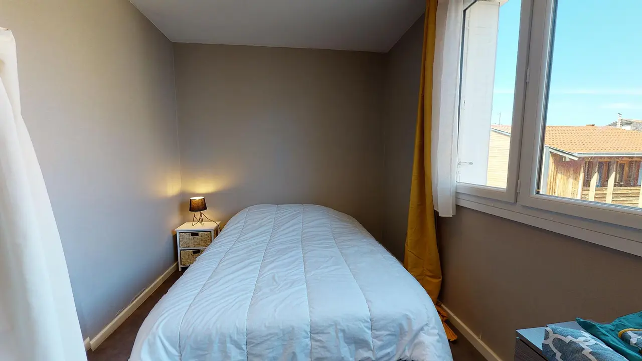 La chambre 3 la plus grande de cette colocation avec ses 13,5m2 offre tout le confort nécessaire grâce à son lit double, son bureau, sa chaise, sa commode et son placard pour ranger ses affaires