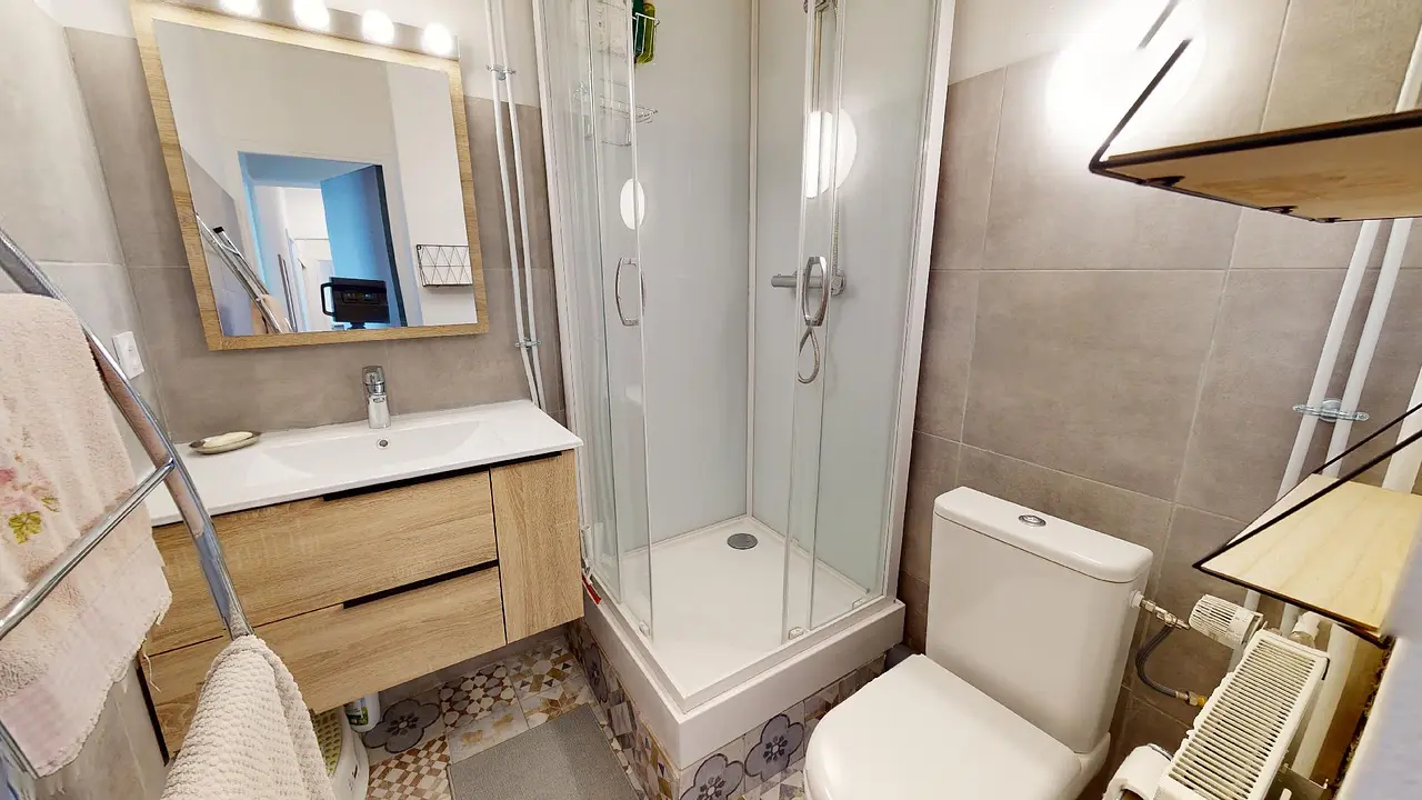 L'appartement dispose de deux salles de bains. La première se compose d'une cabine de douche, un WC, un meuble vasque avec un miroir, des étagères et un porte serviette. La seconde salle de bain avec toilettes séparées dispose d'une grande cabine de douche, un meuble vasque avec un miroir et un porte serviette radiateur.