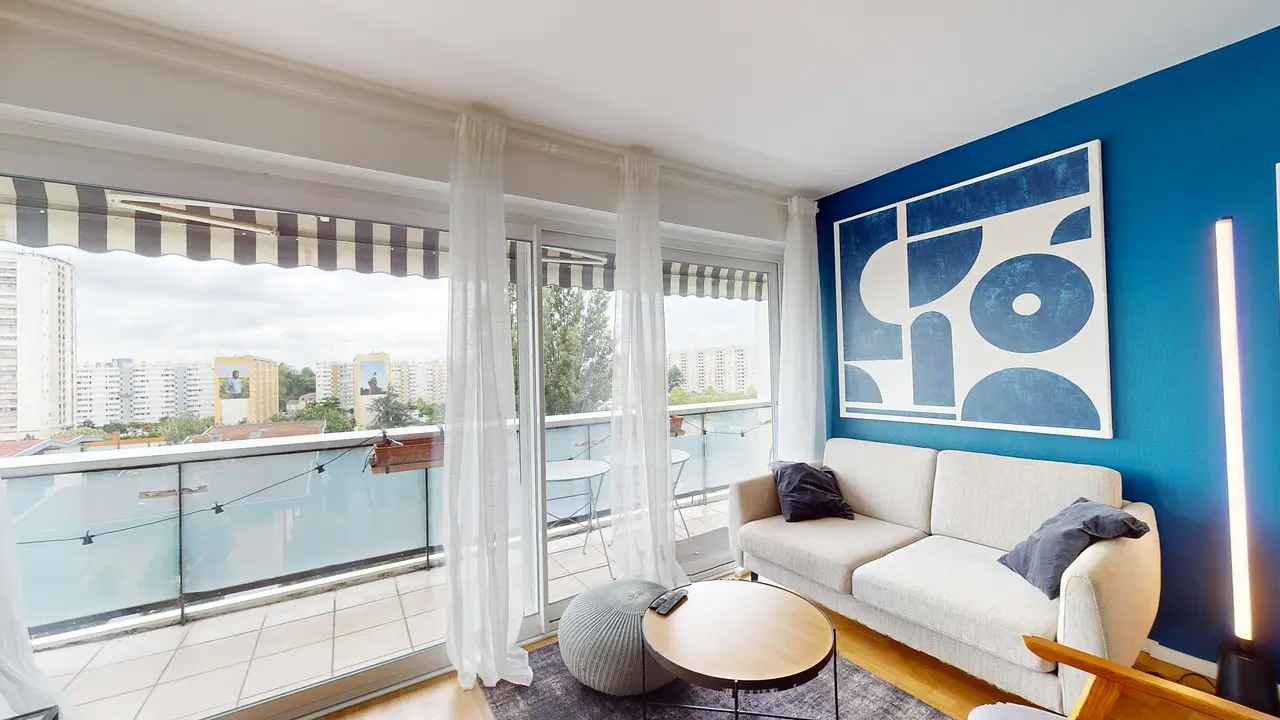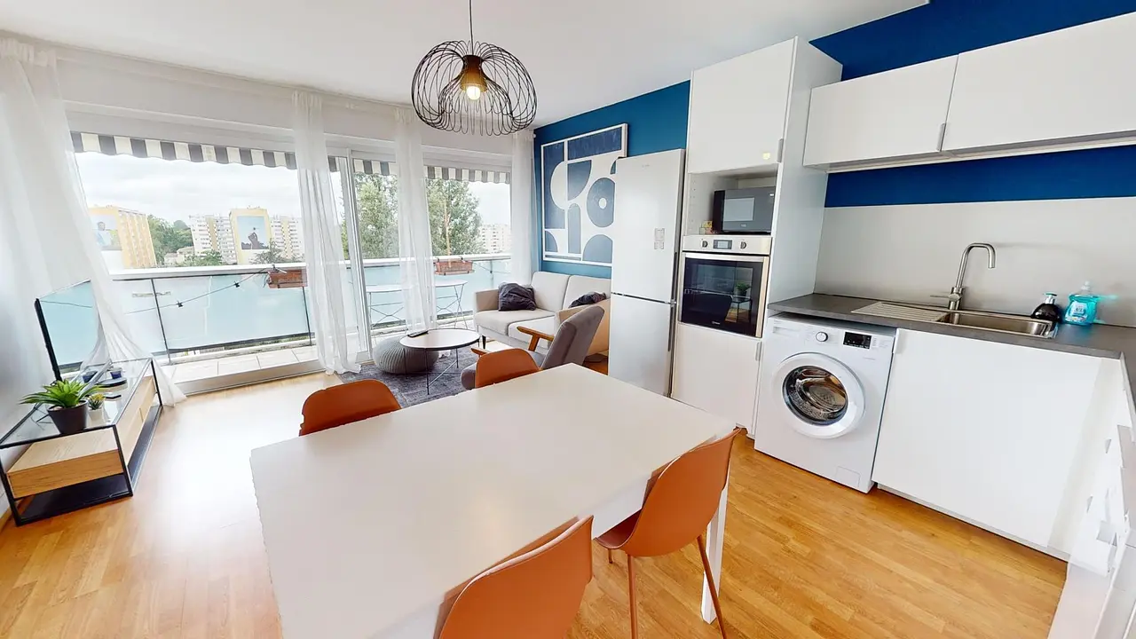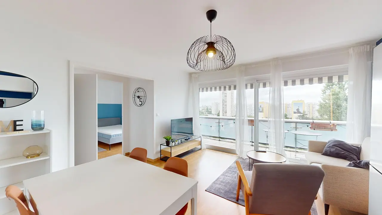 Les espaces de vie sont baignés de lumière naturelle grâce à une grande porte-fenêtre qui s'ouvre sur un balcon, vous offrant un coin extérieur agréable et ensoleillé.