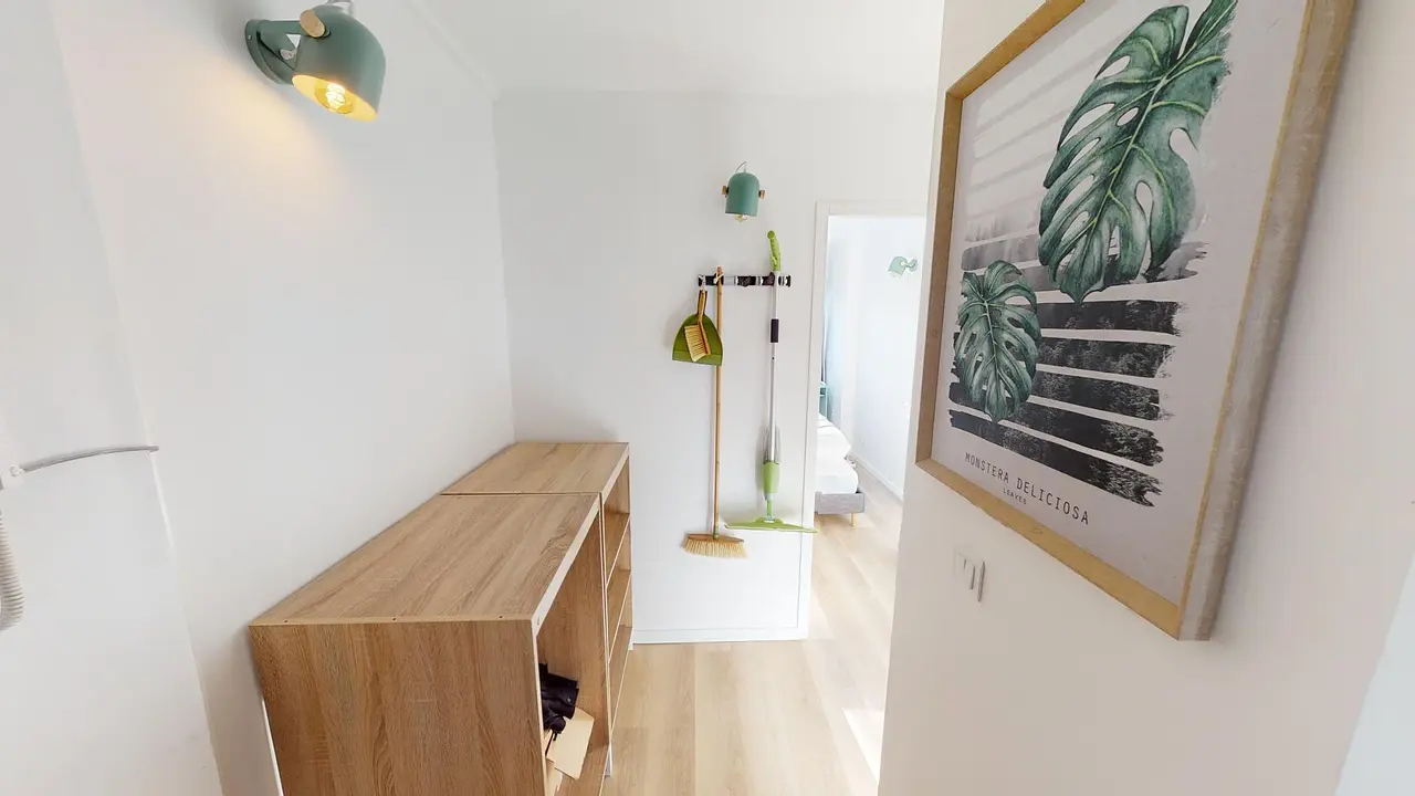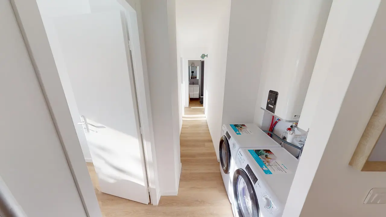 Cette colocation de cinq chambres s'ouvre sur une entrée avec deux meubles de rangements, des produits d'entretien, d'une machine à laver et d'un sèche-linge.