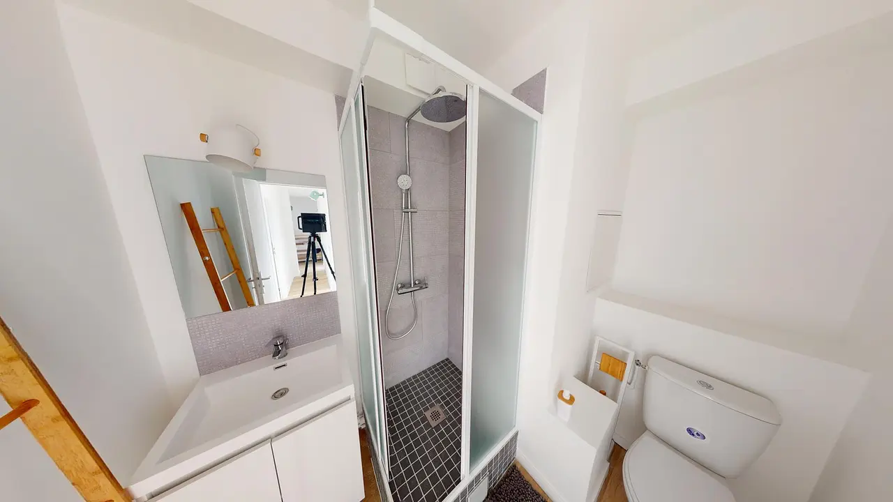 La salle d'eau avec toilettes séparées dispose d'une cabine de douche, d'un meuble vasque avec un miroir, d'un WC ainsi que d'un porte-serviettes.