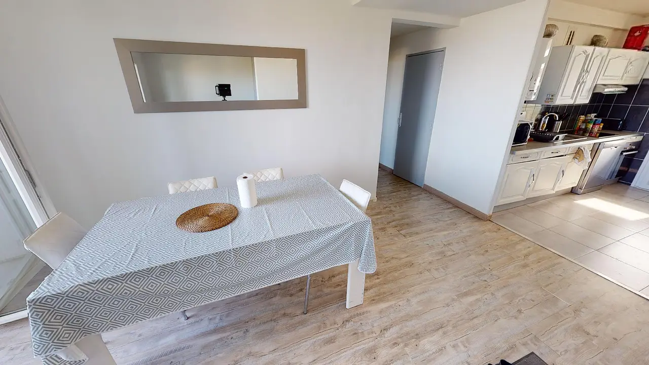 Cet appartement comporte une grande pièce de vie lumineuse avec un coin salon avec canapé d’angle et TV et un coin salle à manger avec table et chaises.