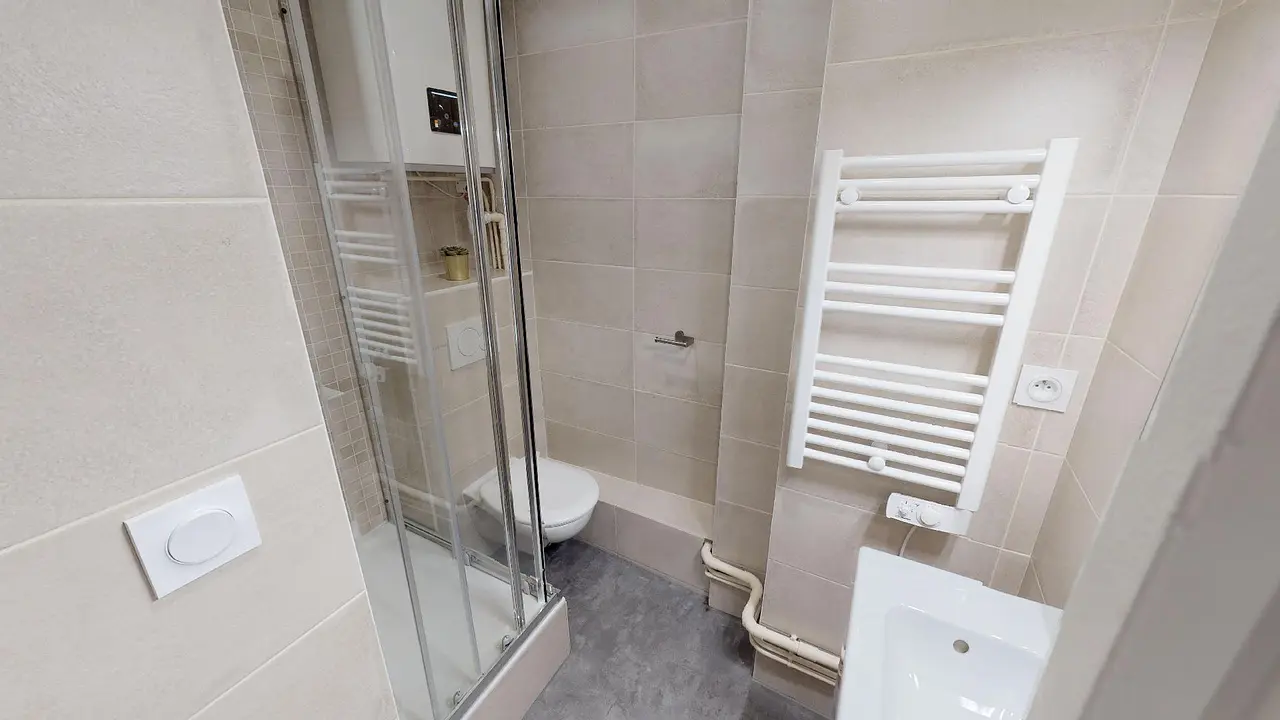 Salle de bain avec douche, radiateur sèche-serviette et WC
