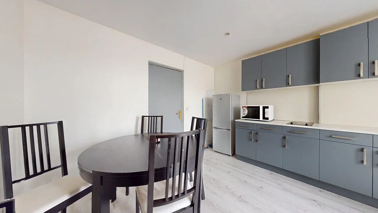 Dès l’entrée, vous découvrez un espace de vie fonctionnel et bien agencé. La cuisine moderne est entièrement équipée : plaque à induction, micro-ondes, réfrigérateur avec congélateur, lave-vaisselle, ainsi qu’une table à manger avec ses chaises. De nombreux rangements viennent compléter cet espace pensé pour le quotidien.