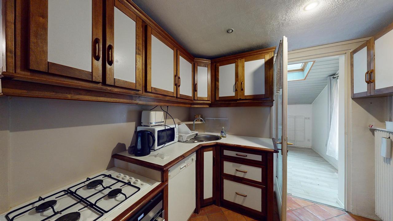 La cuisine est équipée d'un four, de plaques de cuisson, d'un réfrigérateur avec congélateur, d'un lave-vaisselle, de nombreux rangements et de tout le petit électroménager nécessaire.