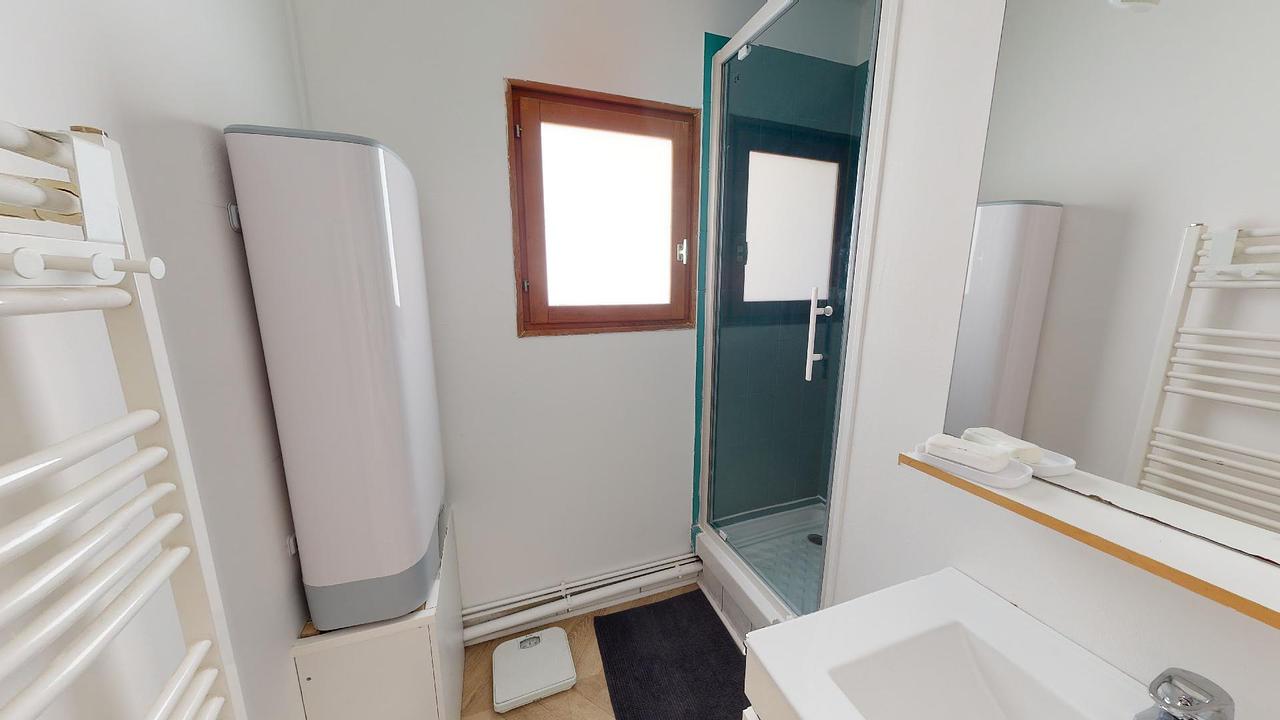La salle de bain comprend une douche, un sèche serviette, un meuble vasque et des wc séparés.