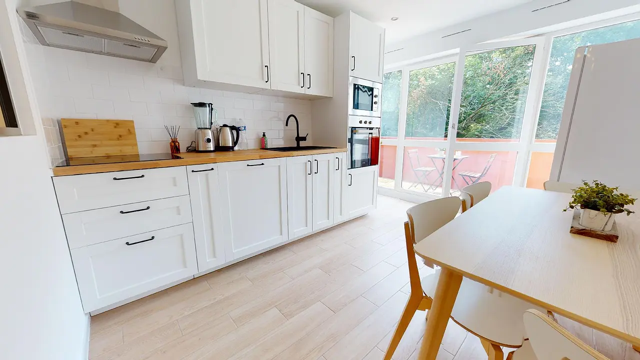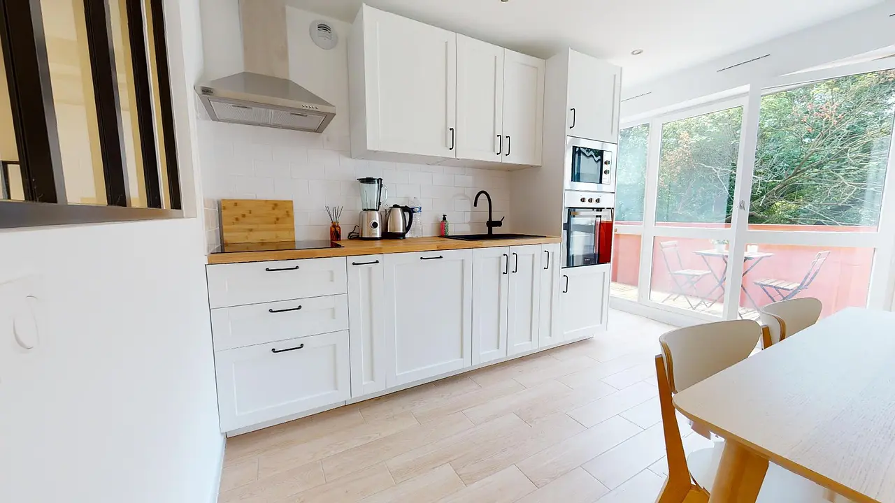 Cette cuisine offre un accès direct à une grande terrasse avec table et chaise !