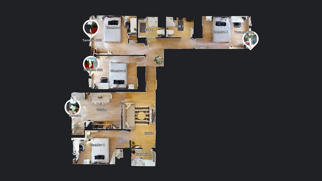 Deux salles de bain avec douches, meubles vasques et WC viennent compléter ce logement.