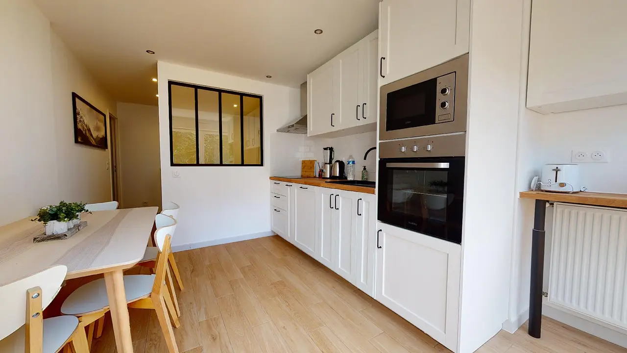 La cuisine quant à elle est séparée et entièrement équipée : four, micro-ondes, plaques de cuisson, hotte, frigo, lave vaisselle, rangements, etc.