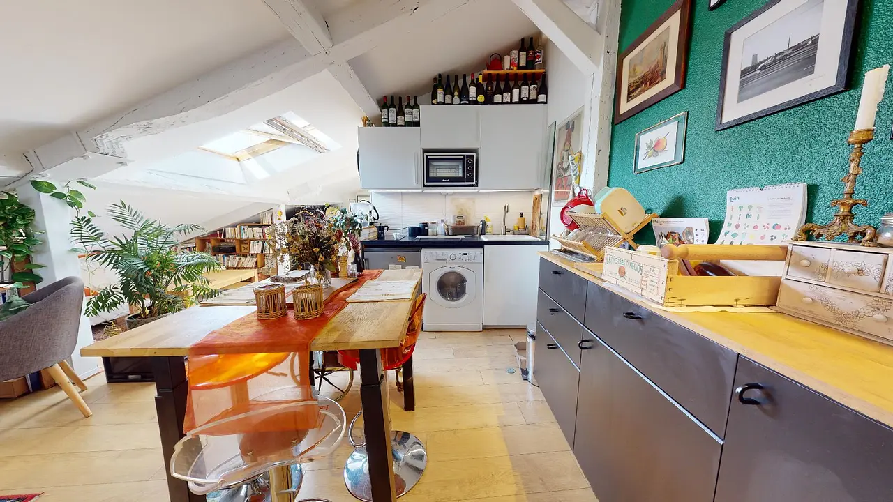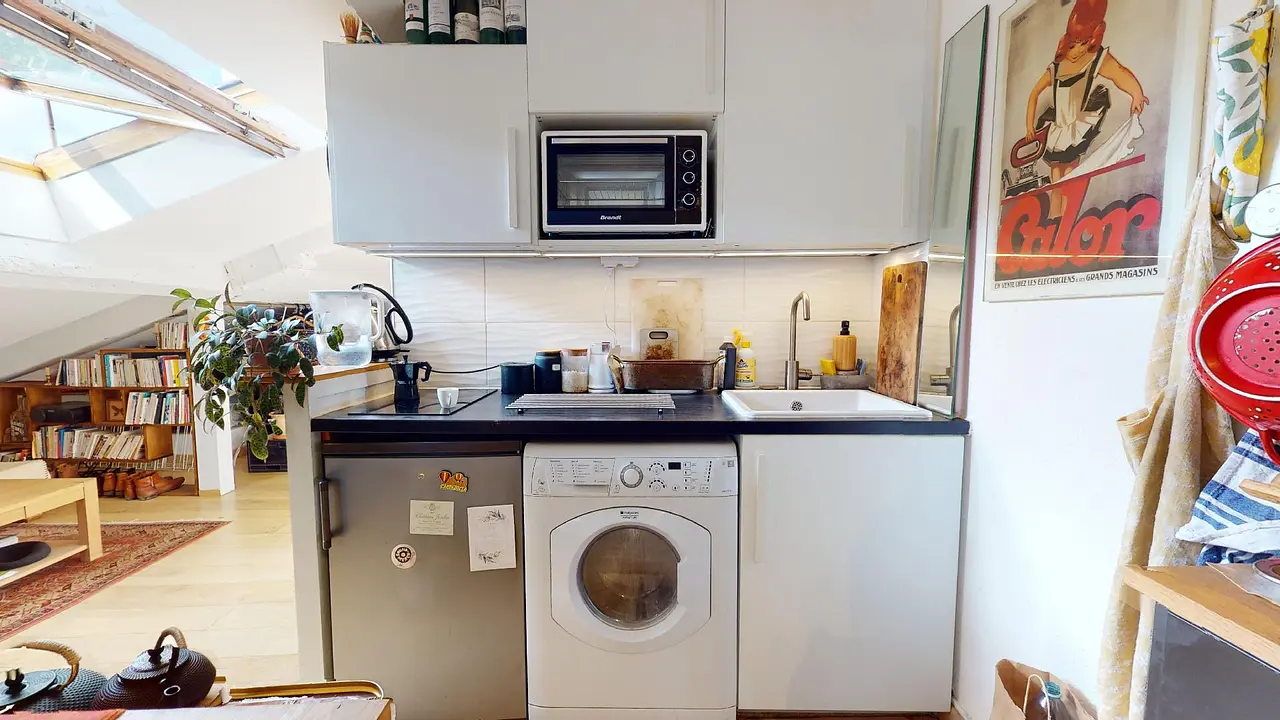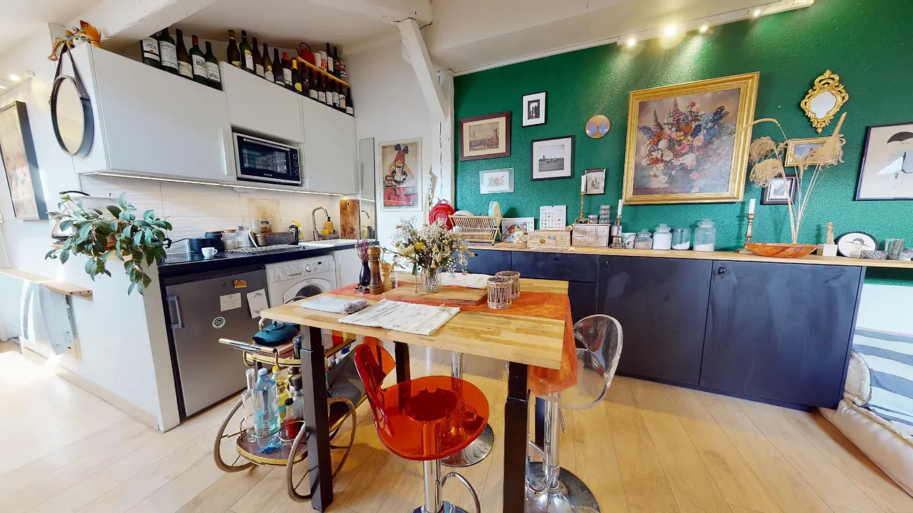 Ce joli studio, proposant une surface au sol de 57 m², dispose d'un coin bureau surélevé en mezzanine, d'un coin salon équipé d'une banquette et d'une table basse, d'une salle de bain équipée d'une jolie douche à l'italienne, de toilettes et d'un meuble vasque, d'un coin nuit proposant un lit double et un second bureau, le tout complété par un coin cuisine/salle à manger équipé d'une table, de ses trois tabourets, d'un long plan de travail, d'un four à micro-ondes, d'une machine à laver et d'un petit réfrigérateur.
